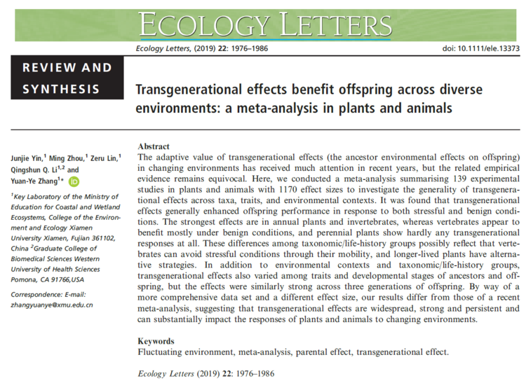 The adaptive value of transgenerational effects (the ancestor environmental effects on offspring) in changing environments has received much attention in recent years, but the related empirical evidence remains equivocal. Here, we conducted a meta‐analysis summarising 139 experimental studies in plants and animals with 1170 effect sizes to investigate the generality of transgenerational effects across taxa, traits, and environmental contexts. It was found that transgenerational effects generally enhanced offspring performance in response to both stressful and benign conditions. The strongest effects are in annual plants and invertebrates, whereas vertebrates appear to benefit mostly under benign conditions, and perennial plants show hardly any transgenerational responses at all. These differences among taxonomic/life‐history groups possibly reflect that vertebrates can avoid stressful conditions through their mobility, and longer‐lived plants have alternative strategies. In addition to environmental contexts and taxonomic/life‐history groups, transgenerational effects also varied among traits and developmental stages of ancestors and offspring, but the effects were similarly strong across three generations of offspring. By way of a more comprehensive data set and a different effect size, our results differ from those of a recent meta‐analysis, suggesting that transgenerational effects are widespread, strong and persistent and can substantially impact the responses of plants and animals to changing environments.