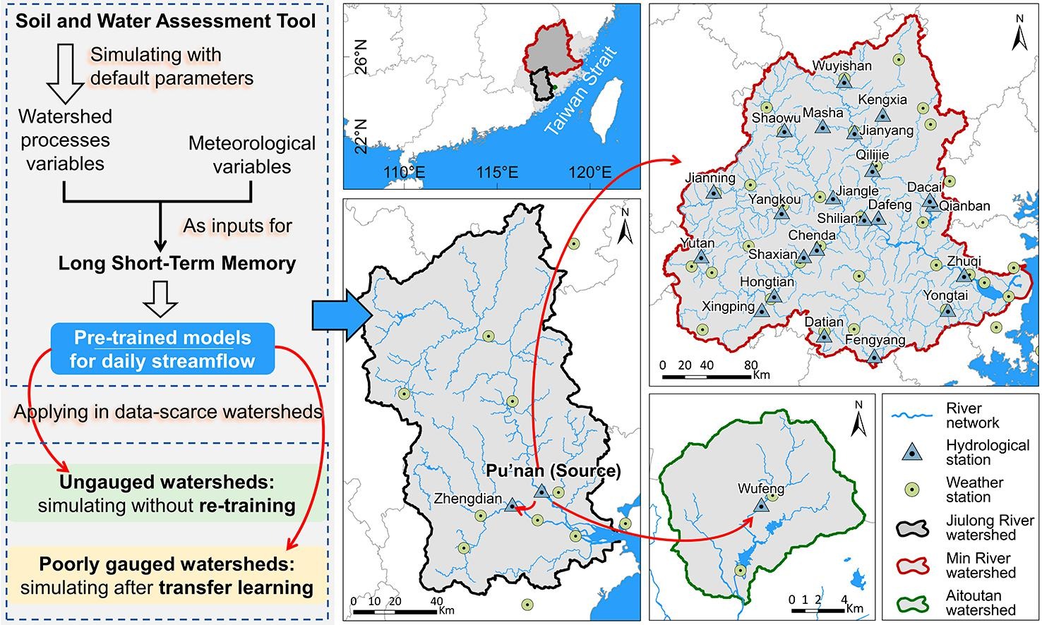 There is a scarcity of streamflow data owing to the limited availability of gauge networks or delayed gauging in most parts of the world. To overcome this challenge and reproduce long-duration daily streamflow in both ungauged and poorly gauged watersheds, we proposed a novel approach that couples the process-based model Soil and Water Assessment Tool (SWAT) and the interpretable machine learning (ML) model long short-term memory (LSTM). The watershed process features generated by SWAT were combined with meteorological features as inputs for LSTM. The coupled SWAT-LSTM approach was first developed in a data-rich coastal watershed in Fujian Province, China. During the testing period, the obtained Nash-Sutcliffe efficiency coefficient (NSE) of SWAT-LSTM is 0.885, which outperformed other SWAT-MLs (e.g., backward propagation neural network, NSE = 0.843; random forest, NSE = 0.838) and calibrated SWAT (NSE = 0.706) used as comparators. Precipitation is considered the most important feature to local streamflow from a ML perspective. The pre-trained SWAT-LSTM presented satisfactory performances over 30 years of simulations in 24 hypothesized data-scarce watersheds. In ungauged watersheds, the NSE ranged from 0.474 to 0.898, with a mean of 0.685. In poorly gauged watersheds, the pre-trained SWAT-LSTM was optimized using limited local observations by introducing the transfer learning technique, and the NSE ranged from 0.591 to 0.918, with a mean of 0.760, which was markedly more accurate than the new trained models locally. Spatial proximity and physical similarity should be considered simultaneously when selecting the optimal source for data-scarce watersheds, as better performance can be achieved in less time than with tandem trained the observations of all sources. This study demonstrates that coupling SWAT with interpretable LSTM enhances the modeling confidence and provides a potential shortcut to achieving long-duration streamflow simulations in both ungauged and poorly gauged watersheds.