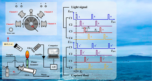 Trace levels of Hg, As, Sb, and Bi in coastal seawater have been simultaneously detected by a laboratory-built multichannel chemical vapor generation coupled to an atomic fluorescence spectrometer. The system was configured with a built-in electrochemical H2 generator as the fuel supplier to replace chemical H2 produced by the oxidation of potassium borohydride under acidic conditions in traditional instruments. The electrochemical H2 generator not only isolated the atomization process from the chemical vapor injection process but also improved the stability of atomization, excitation, and fluorescence emission in the hydrogen flame, making it easier to optimize conditions for CVG while introducing evaporating multielement vapors. Calibrations were obtained using a mixed standard solution of Hg(II), As(III), Sb(III), and Bi(III). The addition of KBr to a 3% (v/v) HCl solution was selected as the preservative to ensure the stability of 0.10 μg/L Hg(II) in a multielement standard solution for at least 15 days while also preserving μg/L levels of As(III), Sb(III), and Bi(III) stable. The method detection limits (LOD, 3σ) were 0.001, 0.015, 0.010, and 0.005 μg/L for Hg, As, Sb, and Bi, respectively. The relative standard deviations (RSD, n = 7) of the standard spiked seawater samples were 3.2% (0.020 μg/L Hg), 1.2% (0.50 μg/L As), 1.0% (0.50 μg/L Sb), and 3.5% (0.050 μg/L Bi), respectively. The recoveries of seawater samples spiked with different salinities were in the range of 84.5%(Sb)–114%(Hg). The system has been successfully applied to the simultaneous analysis of the four elements in the seawater samples collected from Xiamen Bay, Southeast China.