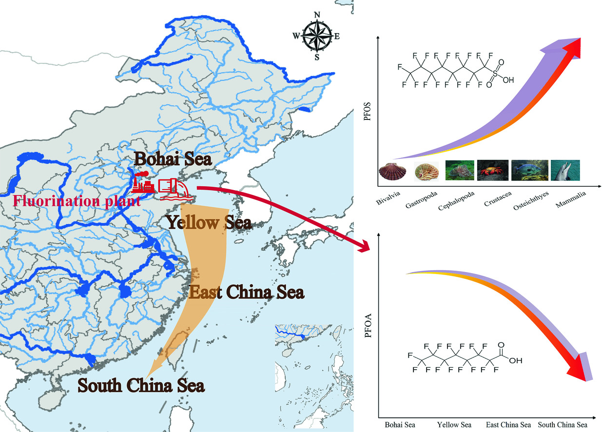Per- and polyfluoroalkyl substances (PFASs) are a large and complex class of synthetic chemicals widely used in industrial and domestic products. This study compiled and analyzed the distribution and composition of PFASs in marine organisms sampled along the coast of China from 2002 to 2020. Perfluorooctane sulfonic acid (PFOS) and perfluorooctanoic acid (PFOA) were dominant in bivalves, cephalopods, crustaceans, bony fish and mammals. PFOA in bivalves, crustaceans, bony fish and mammals gradually decreased from north to south along the coast of China, and the PFOA contents of bivalves and gastropods in the Bohai Sea (BS) and the Yellow Sea (YS) were higher than those of PFOS. The increased production and use of PFOA have been detected by biomonitoring temporal treads in mammals. For the organisms in the East China Sea (ECS) and the South China Sea (SCS), which were less polluted by PFOA compared to BS and YS, PFOS was universally higher than PFOA. The PFOS of mammals with high trophic levels was significantly higher than that of other taxa. This study is conducive to better understanding the monitoring information of PFASs of marine organisms in China and is of great significance for PFAS pollution control and management.