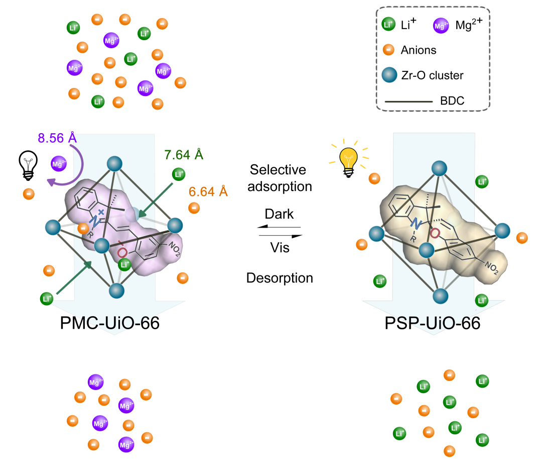 Metal-organic frameworks (MOFs) are superior ion adsorbents for selectively capturing toxic ions from water. Nevertheless, they have rarely been reported to have lithium selectivity over divalent cations due to the well-known flexibility of MOF framework and the similar physiochemical properties of Li+ and Mg2+. Herein, we report an ion-sieving adsorption approach to design sunlight-regenerable lithium adsorbents by subnanoporous MOFs for efficient lithium extraction. By integrating the ion-sieving agent of MOFs with light-responsive adsorption sites of polyspiropyran (PSP), the ion-sieving adsorption behaviors of PSP-MOFs with 6.0, 8.5, and 10.0 Å windows are inversely proportional to their pore size. The synthesized PSP-UiO-66 with a narrowest window size of 6.0 Å shows high LiCl adsorption capacity up to 10.17 mmol g−1 and good Li+/Mg2+ selectivity of 5.8 to 29 in synthetic brines with Mg/Li ratio of 1 to 0.1. It could be quickly regenerated by sunlight irradiation in 6 min with excellent cycling performance of 99% after five cycles. This work sheds light on designing selective adsorbents using responsive subnanoporous materials for environmentally friendly and energy-efficient ion separation and purification.