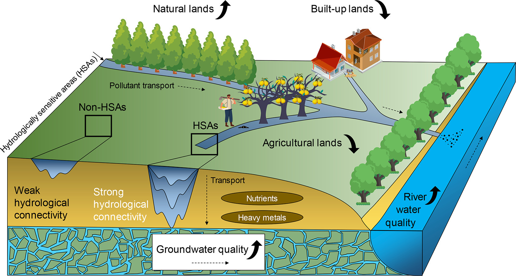 Greening is the optimal way to mitigate climate change and water quality degradation caused by agricultural expansion and rapid urbanization. However, the ideal sites to plant trees or grass to achieve a win–win solution between the environment and the economy remain unknown. Here, we performed a nationwide survey on groundwater nutrients (nitrate nitrogen, ammonia nitrogen, dissolved reactive phosphorus) and heavy metals (vanadium, chromium, manganese, iron, cobalt, nickel, copper, arsenic, strontium, molybdenum, cadmium, and lead) in China, and combined it with the global/national soil property database and machine learning (random forest) methods to explore the linkages between land use within hydrologically sensitive areas (HSAs) and groundwater quality from the perspective of hydrological connectivity. We found that HSAs occupy approximately 20 % of the total land area and are hotspots for transferring nutrients and heavy metals from the land surface to the saturated zone. In particular, the proportion of natural lands within HSAs significantly contributes 8.0 % of the variability in groundwater nutrients and heavy metals in China (p < 0.01), which is equivalent to their contribution (8.8 %) at the regional scale (radius = 4 km, area = 50 km2). Increasing the proportion of natural lands within HSAs improves groundwater quality, as indicated by the significant reduction in the concentrations of nitrate nitrogen, manganese, arsenic, strontium, and molybdenum (p < 0.05). These new findings suggest that prioritizing ecological restoration in HSAs is conducive to achieving the harmony between the environment (improving groundwater quality) and economy (reducing investment in area management).