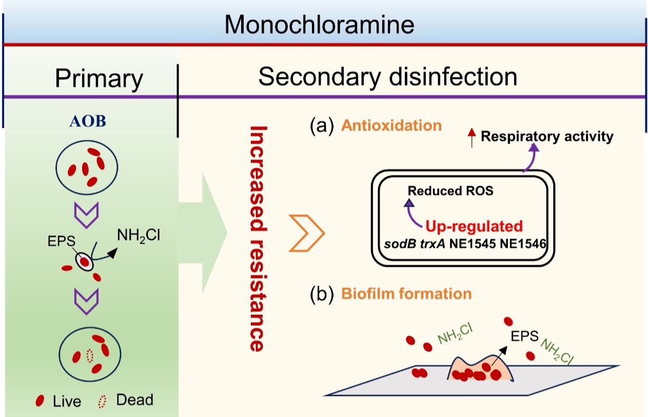 Chloramination is an effective strategy for eliminating pathogens from drinking water and repressing their regrowth in water distribution systems. However, the inevitable release of NH4+ potentially promotes nitrification and associated ammonia-oxidizing bacteria (AOB) contamination. In this study, AOB (Nitrosomona eutropha) were isolated from environmental water and treated with two disinfection stages (chloramine disinfection and chloramine residues) to investigate the occurrence mechanisms of AOB in chloramination. The results showed that N. eutropha had considerable resistance to monochloramine compared to Escherichia coli, whose inactivation rate constant was 19.4-fold lower. The higher resistance was attributed to high levels of extracellular polymer substances (EPS) in AOB, which contribute to AOB surviving disinfection and entering the distribution system. In AOB response to the chloramine residues stage, the respiratory activity of N. eutropha remained at a high level after three days of continuous exposure to high chloramine residue concentrations (0.5–1.5 mg/L). Reverse transcription-quantitative polymerase chain reaction (RT-qPCR) suggested that the mechanism of N. eutropha tolerance involved a significantly high expression of the intracellular oxidative stress-regulating (sodB, txrA) and protein-related (NE1545, NE1546) genes. Additionally, this process enhanced EPS secretion and promoted biofilm formation. Adhesion predictions based on the XDLVO theory corroborated the trend of biofilm formation. Overall, the naturally higher resistance contributed to the survival of AOB in primary disinfection; the enhanced antioxidant response of surviving N. eutropha accompanied by biofilm formation was responsible for their increased resistance to the residual.