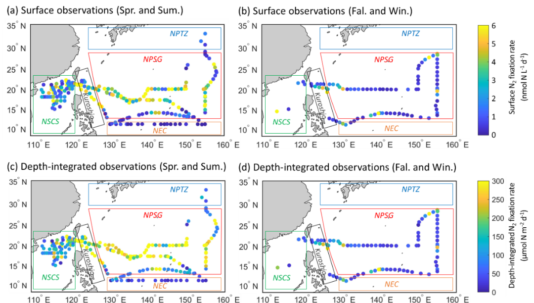 The (sub)tropical western North Pacific is potentially an area of intense nitrogen (N2) fixation in the global ocean, despite limited understanding of the flux and controlling factors. We conducted high-resolution observations from 2016 to 2021 in this region and used machine learning algorithms to simulate N2 fixation flux. Models estimated an N2 fixation flux from 5.72 to 6.45 Tg N yr−1, with strong seasonal variation and peak rates in summer. The western North Pacific Subtropical Gyre and the Kuroshio Current contributed more to N2 fixation flux than did the adjacent areas. Models suggested that sea surface temperature, photosynthetically available radiation, and nutrient supply were most strongly correlated with seasonal and spatial variations in N2 fixation. This study provides an improved estimation of N2 fixation in the western North Pacific and advances our understanding of its role in ocean productivity.