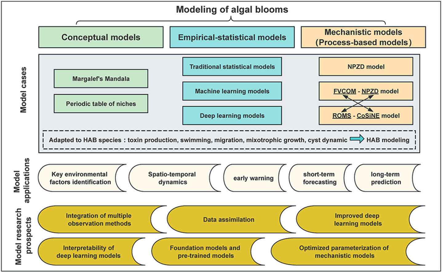 Algal blooms represent a pivotal ecological phenomenon in marine ecosystems, exerting significant influence on energy transfer, material cycling, and ecological structure and function. The frequent occurrence of harmful algal blooms (HABs) directly jeopardizes ecosystem integrity, compromises food safety, and challenges the sustainability of food supply, thereby affecting socio-economic development and human well-being. In recent decades, technological advancements in in-situ monitoring and remote sensing have greatly improved our capacity to monitor the oceans, providing unparalleled opportunities for not only the detection of algal blooms but also their dynamic processes and mechanisms. However, monitoring programmes are not always capable of covering the temporal and spatial scale of algal blooms, especially in open water ecosystems. Therefore, it remains essential to utilize models for interpreting observational results. In this review, we evaluated recent studies on models of algal blooms, which can be categorized into three main types: conceptual models, empirical-statistical models (from simple machine learning models to state-of-the-art deep learning models), and mechanistic models (process-based models). We reviewed the development and refinement of representative cases for each model type and compared their applicability, strengths, and limitations. Subsequently, we summarized the applications of these models in exploring algal bloom dynamics, short-term forecasting (a few days to seasonal), and long-term predictions (interannual or longer). We also proposed several recommendations for how algal bloom modeling can move forward: 1) Integrate various automated monitoring platforms and remote sensing techniques to obtain more comprehensive data for model validation; 2) Develop more powerful deep learning models to fully exploit their immense potential in algal bloom prediction; and 3) Incorporate molecular ecology and omics technologies to enhance parameterization schemes for numerical models.
