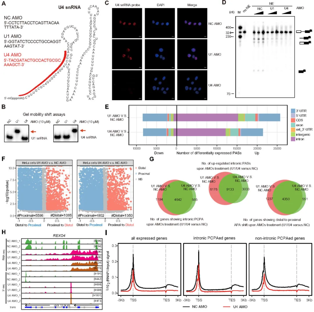 The essential role of U4 snRNP in pre-messenger RNA (mRNA) splicing has been well established. In this study, we utilized an antisense morpholino oligonucleotide (AMO) specifically targeting U4 snRNA to achieve functional knockdown of U4 snRNP in HeLa cells. Our results showed that this knockdown resulted in global intronic premature cleavage and polyadenylation (PCPA) events, comparable to the effects observed with U1 AMO treatment, as demonstrated by mRNA 3′-seq analysis. Furthermore, our study suggested that this may be a common phenomenon in both human and mouse cell lines. Additionally, we showed that U4 AMO treatment disrupted transcription elongation, as evidenced by chromatin immunoprecipitation sequencing (ChIP-seq) analysis for RNAPII. Collectively, our results identified a unique role for U4 snRNP in the inhibition of PCPA and indicated a model wherein splicing intrinsically inhibits intronic cleavage and polyadenylation in the context of cotranscriptional mRNA processing.