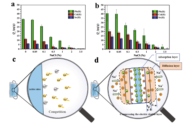 Fig. 3. Influence of the NaCl on the adsorption of metal ions (Pb(II), Cd(II), and Sr(II)) onto pristine (a) and aged (b) DFMs; Schematic illustrating the competition of the active sites (c) and the compression of the electric double layer thickness of the DFMs surfaces (d) is due to the addition of a large amount of Na+.