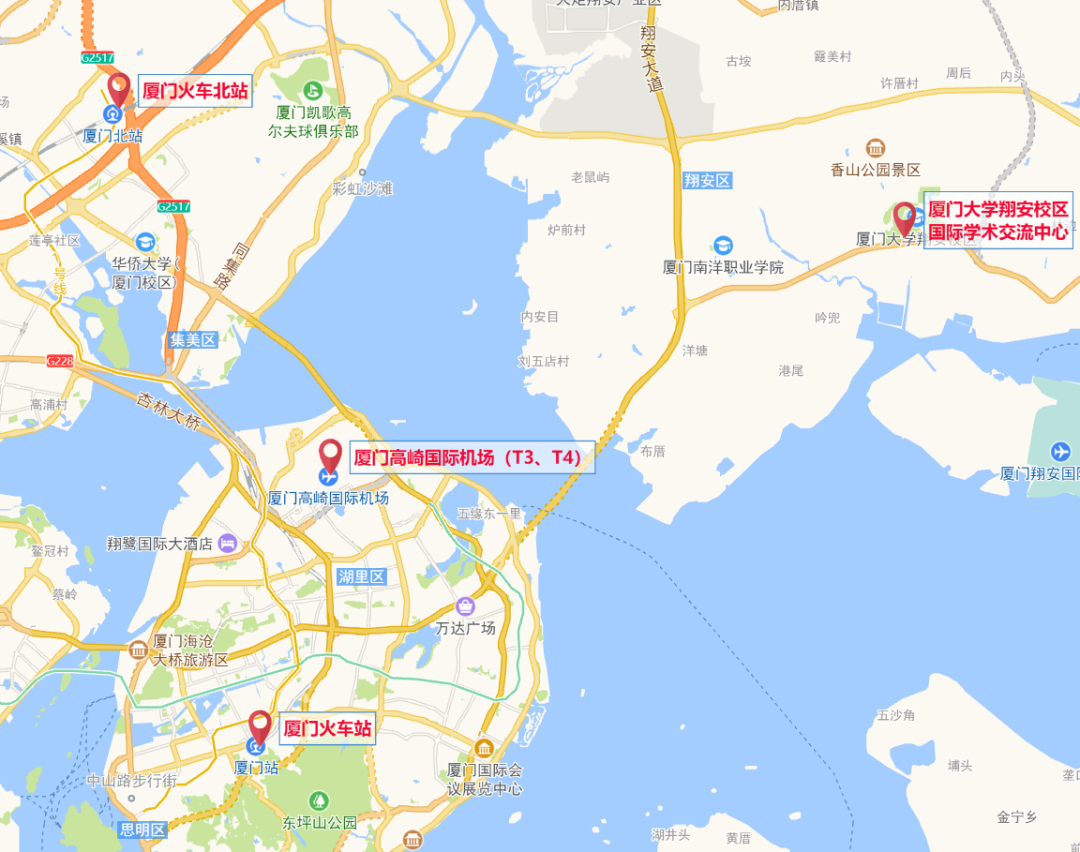 厦门高崎国际机场距翔安校区约40公里,厦门火车站距翔安校区约49公里,厦门火车北站距翔安校区约35公里,可乘坐的士或网约车至厦大翔安校区西侧门。