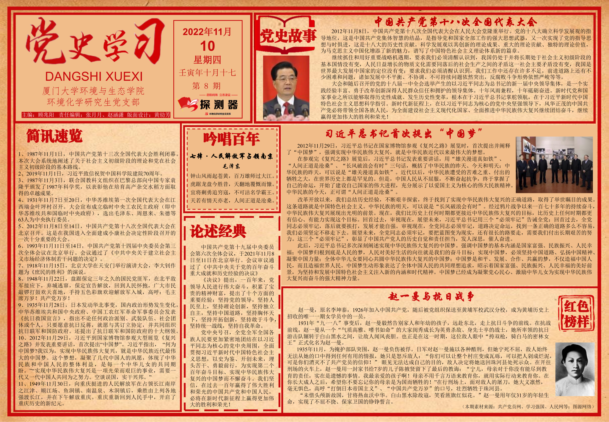 《党史学习》第8期如期而至。本期的【党史故事】重温了党的十八大,见证中国进入新时代的历史里程碑,回顾了习近平总书记首次提出的全国人民的中国梦;【红色榜样】板块回顾了伟大的抗日英雄赵一曼的光辉人生,刻骨铭心的抗日战争时时刻刻警醒着我们和平来之不易;【吟唱百年】《七律·人民解放军占领南京》是一首叙述了轰轰烈烈的解放战争中最后一役的革命史诗,它以豪气万丈的笔锋为我们呈现了波澜壮阔的渡江战役,形象地展现了红军战士们坚忍不拔、脚踏实地的作风;【简讯速览】追溯了党史上跌宕起伏的十一月。