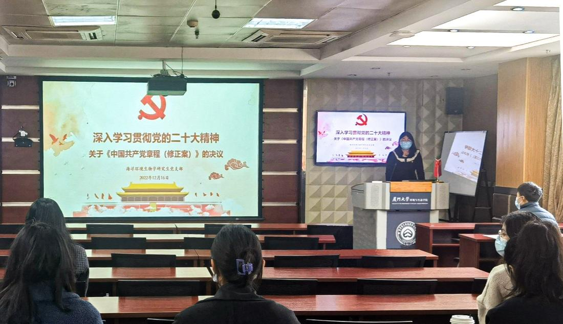 12月16日中午,海洋环境生物学研究生党支部在金泉楼A239报告厅开展《中国共产党章程》的专题学习。本次学习活动由支部书记张伟平主持、支部全体党员、积极分子参加。