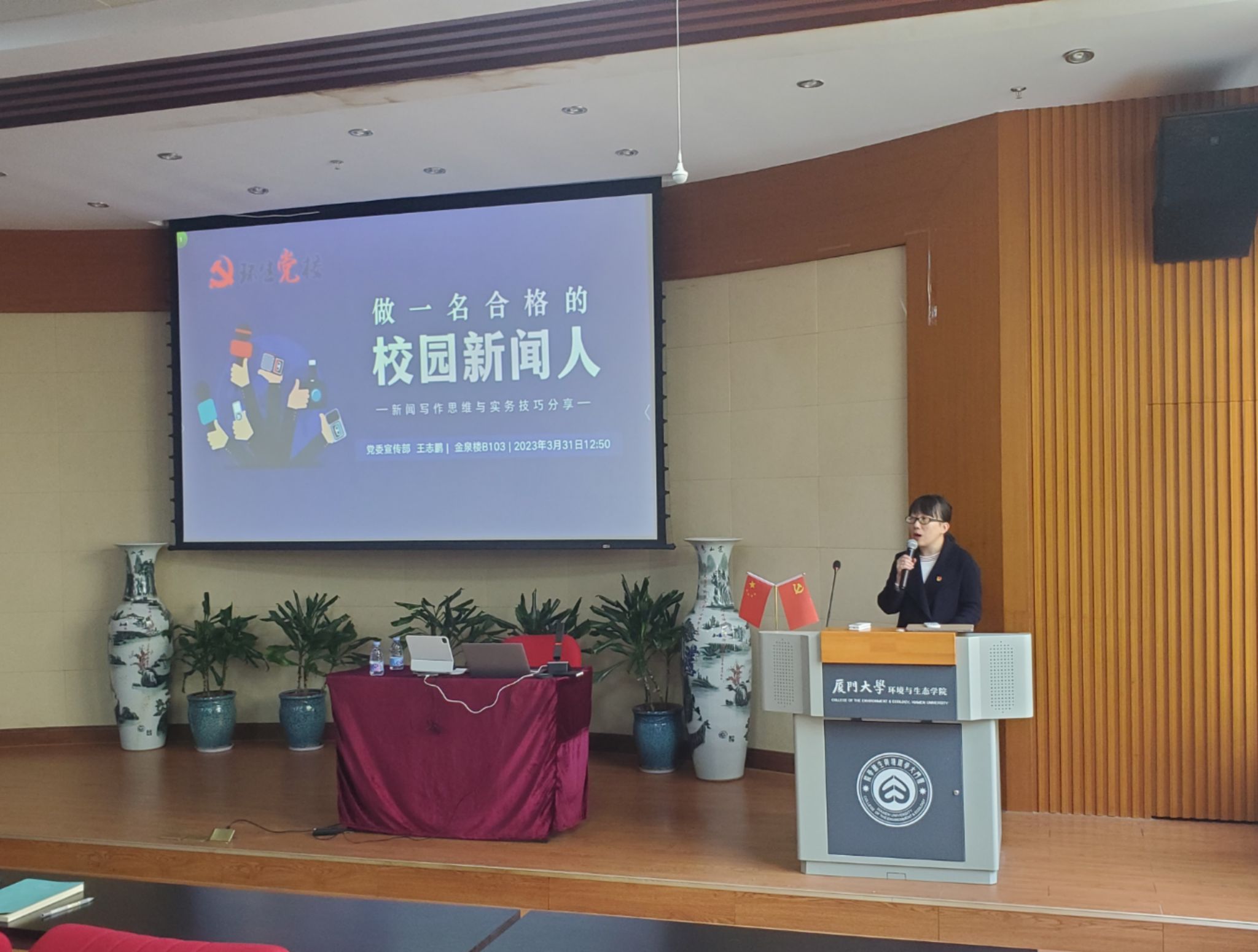 3月31日中午,我院在金泉楼B103面向学院师生党员开展新闻写作专题培训。本次培训以“做一名合格的校园新闻人”为主题,邀请厦门大学党委宣传部校报编辑部编辑王志鹏担任主讲人。培训由院党委副书记刘莉颖主持。