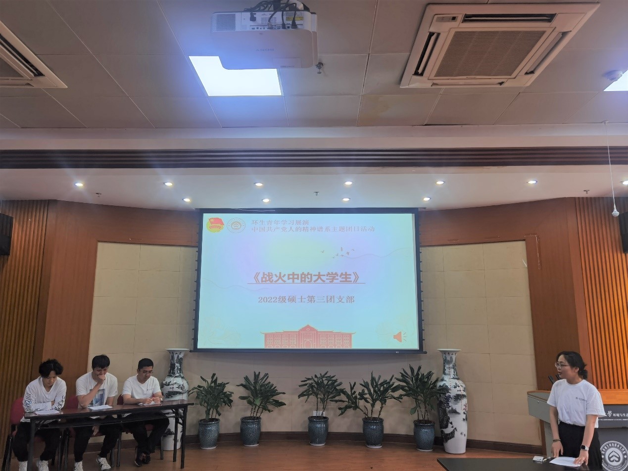 2022级硕士第三团支部的同学们通过生动的表演再现了西南联大文化抗战的历史,展现了《战火中的大学生》忠贞爱国之情和追求真理的精神,以及他们在抗日战争的大背景下勇敢抵御侵略者的英勇事迹。