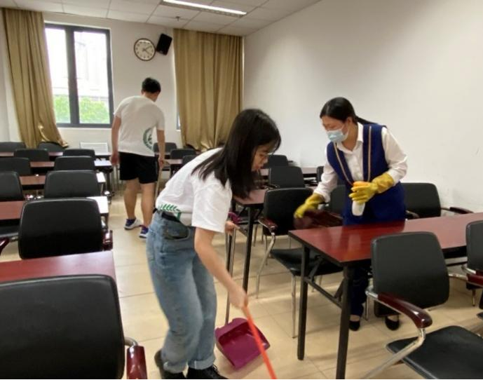 在学院楼道内,支部成员跟随负责保洁工作的梁阿姨一同体验了日常的清扫和垃圾分类工作。清扫过程中,大家先用酒精擦拭桌面,而后检查桌椅的洁净程度,最后依次使用扫把和拖把将地面打理干净。梁阿姨向支部成员介绍,“我每天会进行两轮清扫,分别在早上七点和下午两点。除了进行行政办公室、教室和卫生间的清扫外,同时检查楼道中消防栓、药箱和门框等处是否干净整洁,并及时对垃圾桶内的垃圾进行分类处理。”