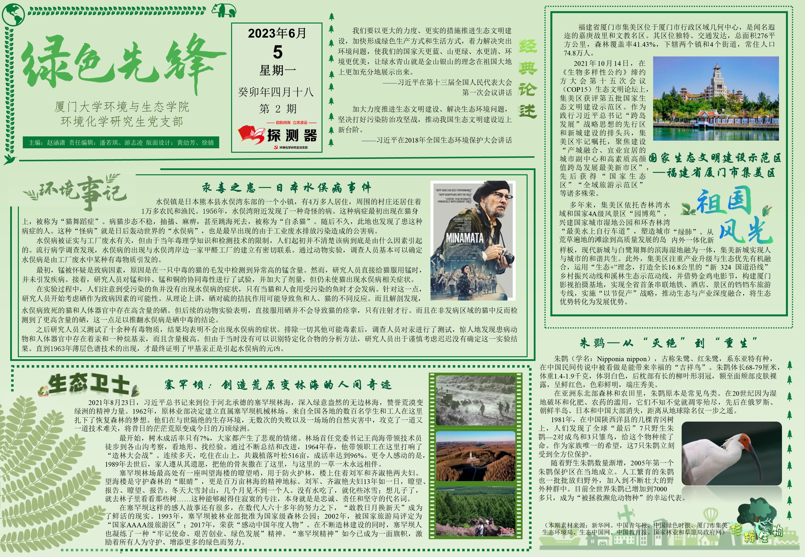 《绿色先锋》第2期如期而至。本期的“环境事记”聚焦世界八大公害事件之一——日本水俣病事件;“生态卫士”板块以享誉中外的塞罕坝林场建设者为主角,展现了“牢记使命、艰苦创业、绿色发展”的塞罕坝精神;“经典论述”中重温习近平总书记在《生物多样性公约》第十五次缔约方大会第二阶段高级别会议开幕式上的致辞和在第十三届全国人民代表大会第一次会议的讲话等重要论述;“祖国风光”带我们领略国家生态文明建设示范区——厦门市集美区的精神风貌;“珍稀生物”板块让朱鹮重回视野,再次阐释了保护生物多样性的深刻意义。