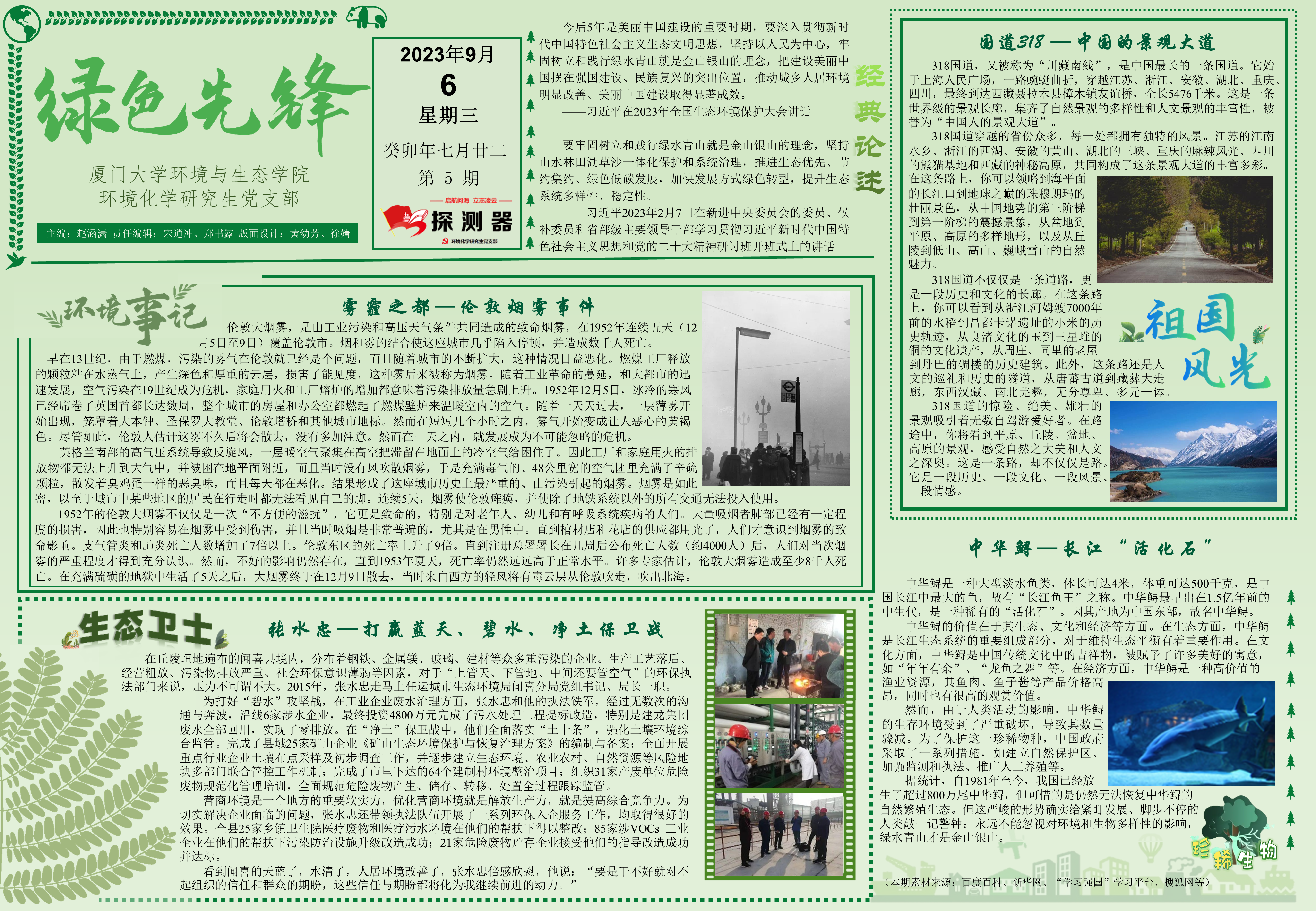 《绿色先锋》第五期如期而至。本期的“环境事记”聚焦世界八大公害事件之一——雾霾之都伦敦的烟雾污染事件;“生态卫士”板块以闻喜卫士张水忠为主角,坚定打赢蓝天、碧水、净土保卫战,紧密落实绿色发展的宗旨要义;“经典论述”中重温了习近平总书记在2023年全国生态环境保护大会的讲话等重要论述;“祖国风光”带我们领略了中国的景观大道——国道318沿路的壮丽美景;“珍稀生物”板块介绍了长江“活化石”中华鲟,深刻揭示了生物濒危对环境和生物多样性的严峻影响。