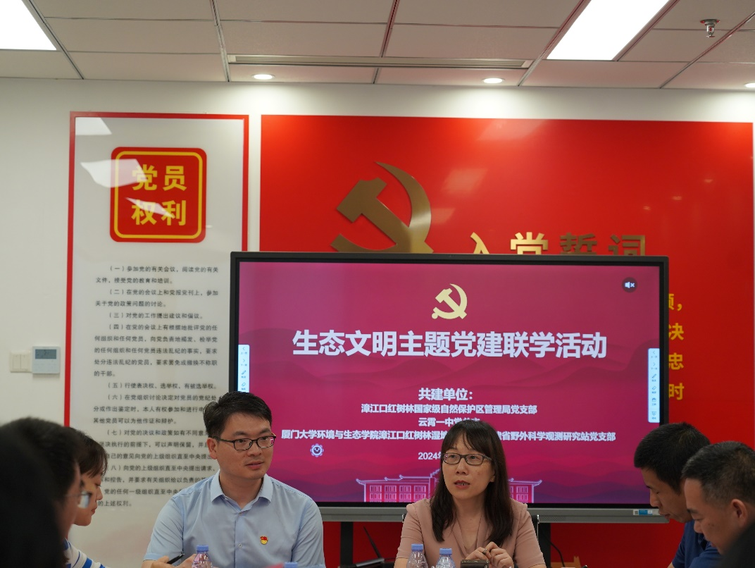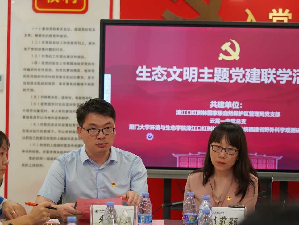 学院党委副书记刘莉颖代表学院对联学单位同志们的到来表示热烈欢迎,并重点介绍了学院党委的基本情况及党建特色品牌。红树林党支部书记、学院副教授朱旭东,云霄一中党总支书记、校长高进金,以及漳江口红树林国家级自然保护区管理局党组书记、局长朱添泉依次发言,分别介绍了各自党组织的成立背景、发展历程和建设现状。