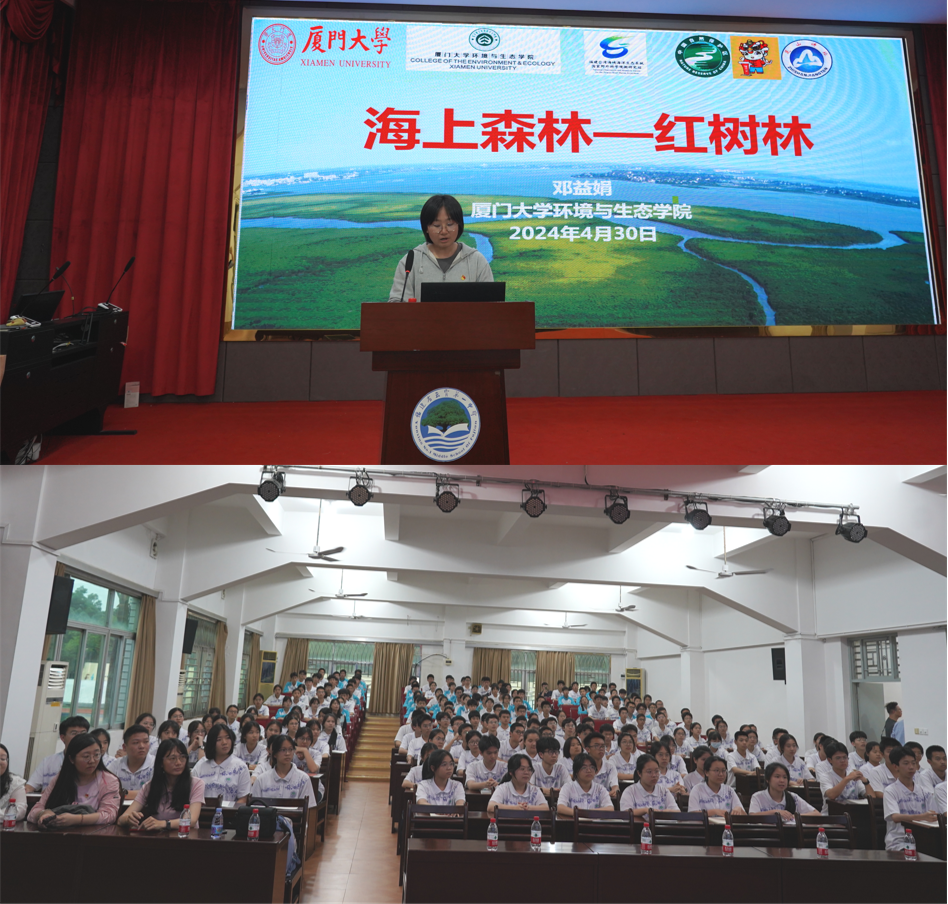 座谈会结束后,一行人前往云霄一中开展特色科普讲座。红树林党支部组织委员、我院博士研究生邓益娟以《海上森林——红树林》为主题向云霄一中200余名师生讲解了红树林知识,学生们积极提问、踊跃发言,现场气氛十分热烈。