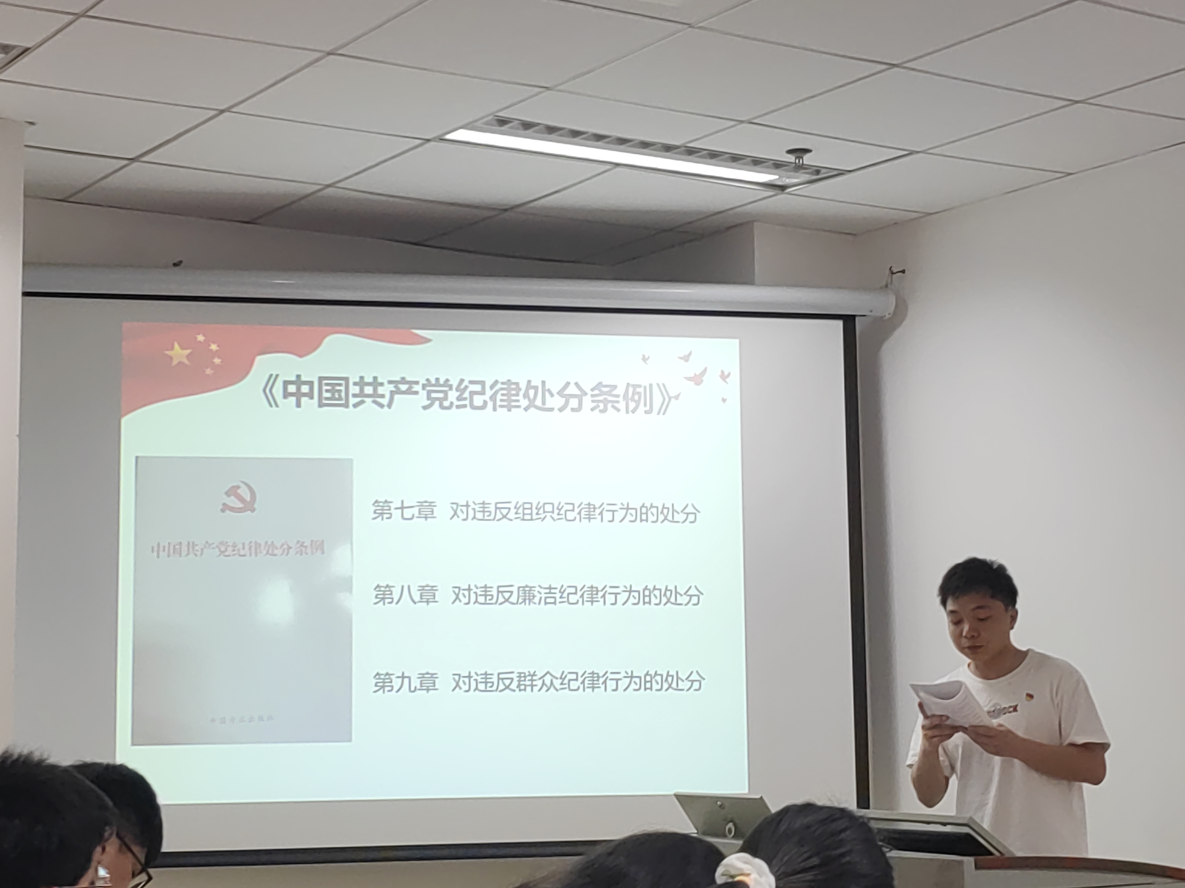 谢弘宇同志带领支部党员原原本本学习了《中国共产党纪律处分条例》和《普通高等学校违纪违法典型案例汇编》,引导党员同志率先做到学纪、知纪、明纪、守纪,始终做到忠诚干净担当,并结合实际案例强调党员同志自觉遵守《条例》规定的必要性。他要求大家要以身作则,严格执行党章,全面贯彻党内处分条例和党内监督条例,自觉接受来自各方面的监督。