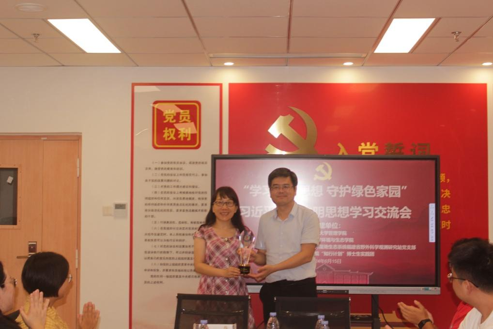 学习交流环节结束后,管理学院党委副书记周民钦代表“知行计划”博士生实践团向红树林党支部赠送刻有“知行合一”的水晶纪念牌,我院党委副书记刘莉颖代表支部接受赠礼。