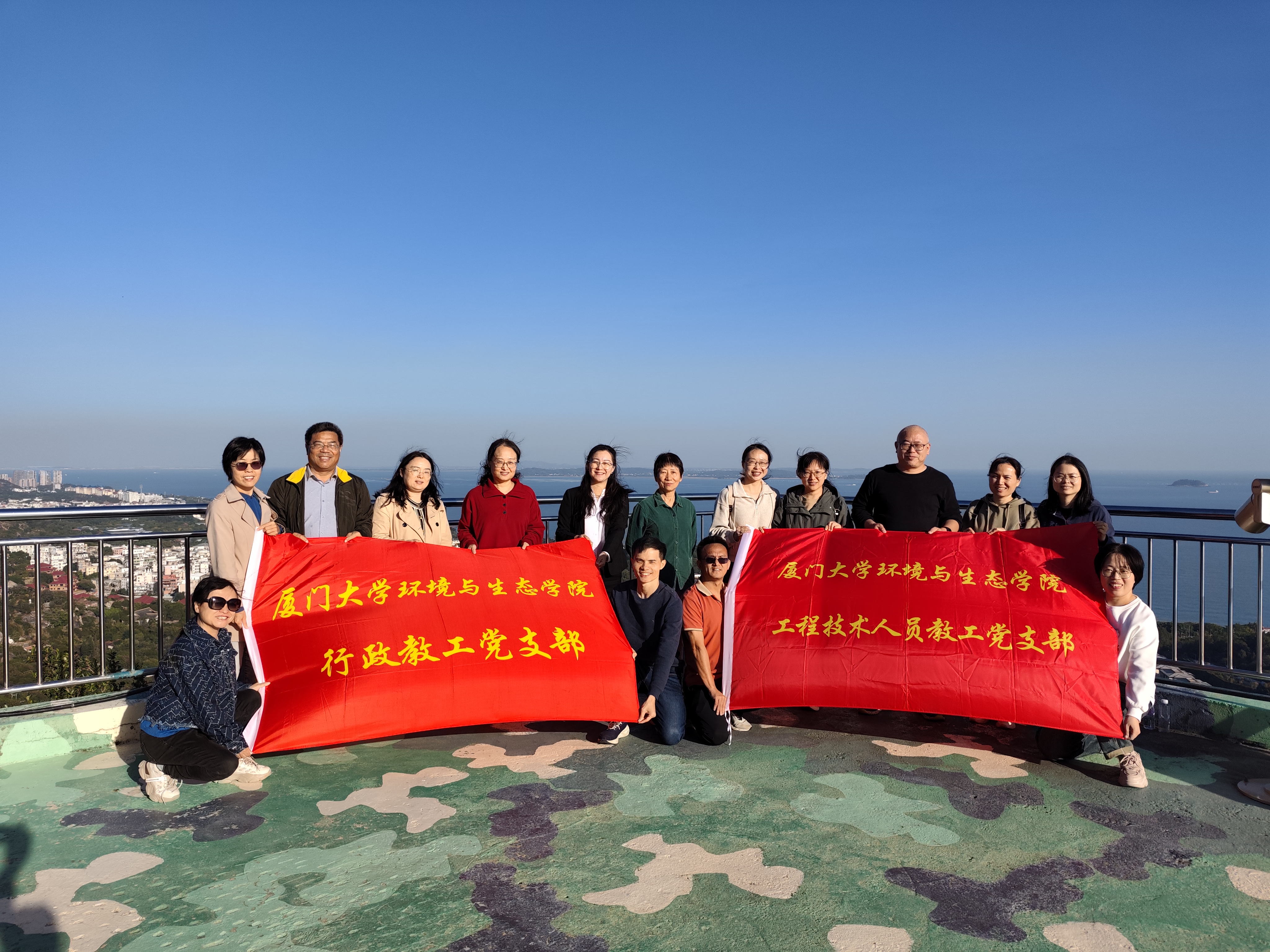在官兵的热情引导下,大家首先参观了营区和观测平台。面临厦金海峡的观测平台,在蓝天白云的映衬下显得格外宽阔庄严。每一位参观者通过望远镜,仔细观察了小金门岛。在平台上,全体成员整齐列队集体合影留念,镜头定格了这一刻的庄重与自豪。