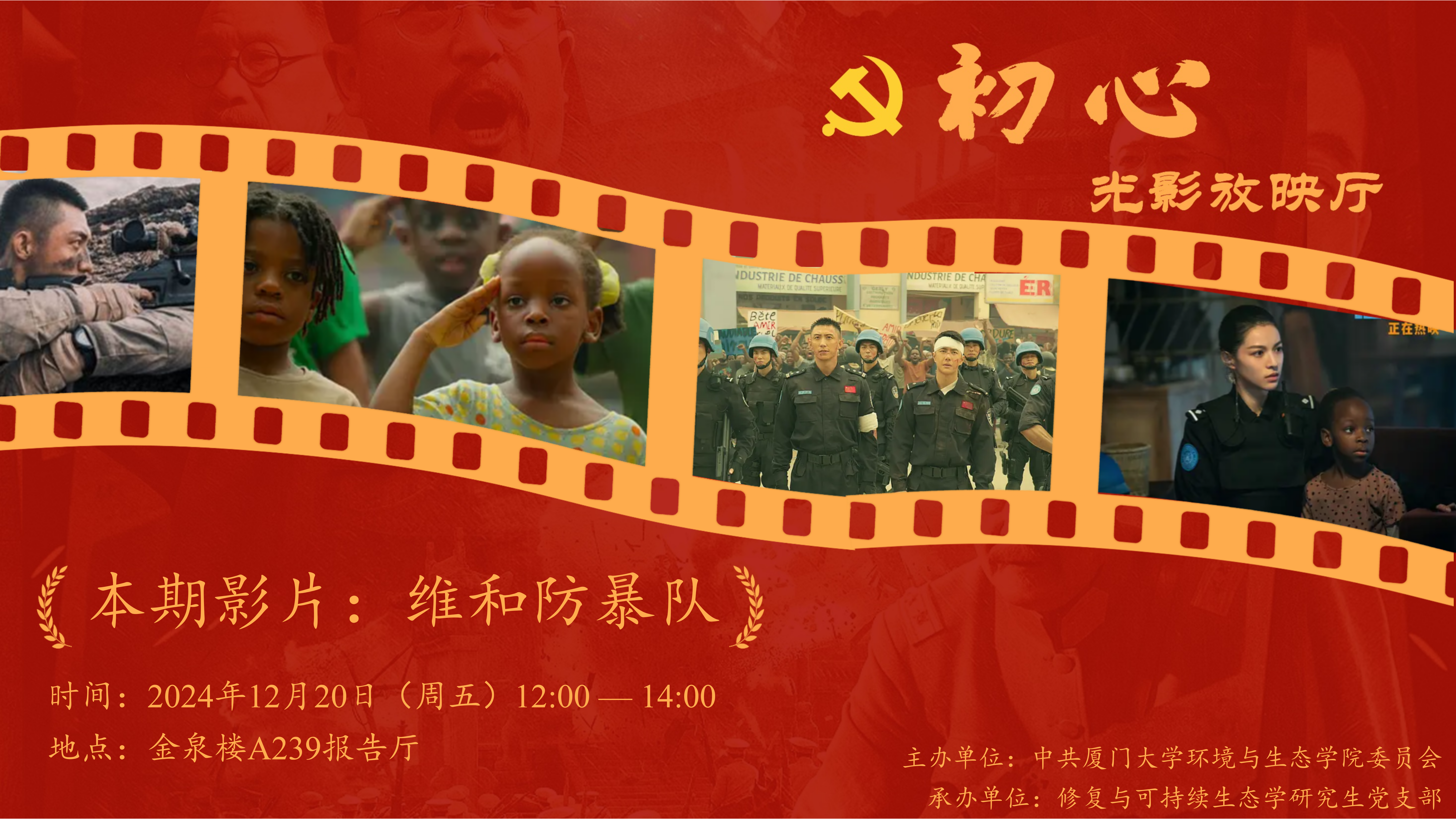 2024年12月20日中午,学院第十九期“初心光影放映厅”活动在金泉楼A239举行。本期观看电影《维和防暴队》,活动由学院党委主办,修复与可持续生态学研究生党支部承办,学院部分师生党员及入党积极分子前来观影。