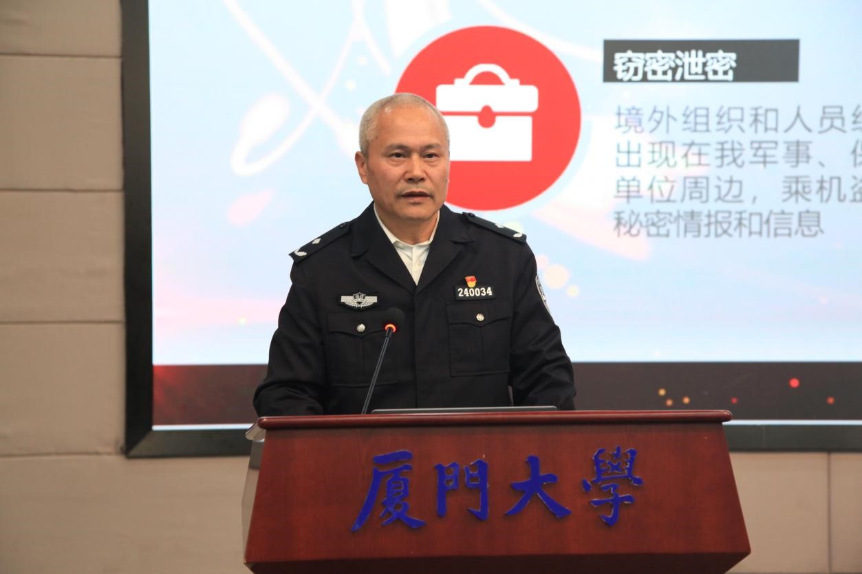 为深入贯彻习近平总书记关于国家安全的重要论述,积极响应中共中央政治局关于建设更高水平平安中国的号召,进一步深化巩固青年学生的国家安全意识,引导青年学生深入学习贯彻总体国家安全观,3月10日下午,学院在德旺图书馆2号报告厅举办“环生党校”2025年第三讲,厦门市公安局国保支队高校文化保卫大队二级高级警长肖殿伟警官受邀以“维护国家安全 从你我做起”为题作精彩报告。学院学生全体党员以及2024级新生等200余人听讲。讲座由学院党委副书记蔡虎堂主持。