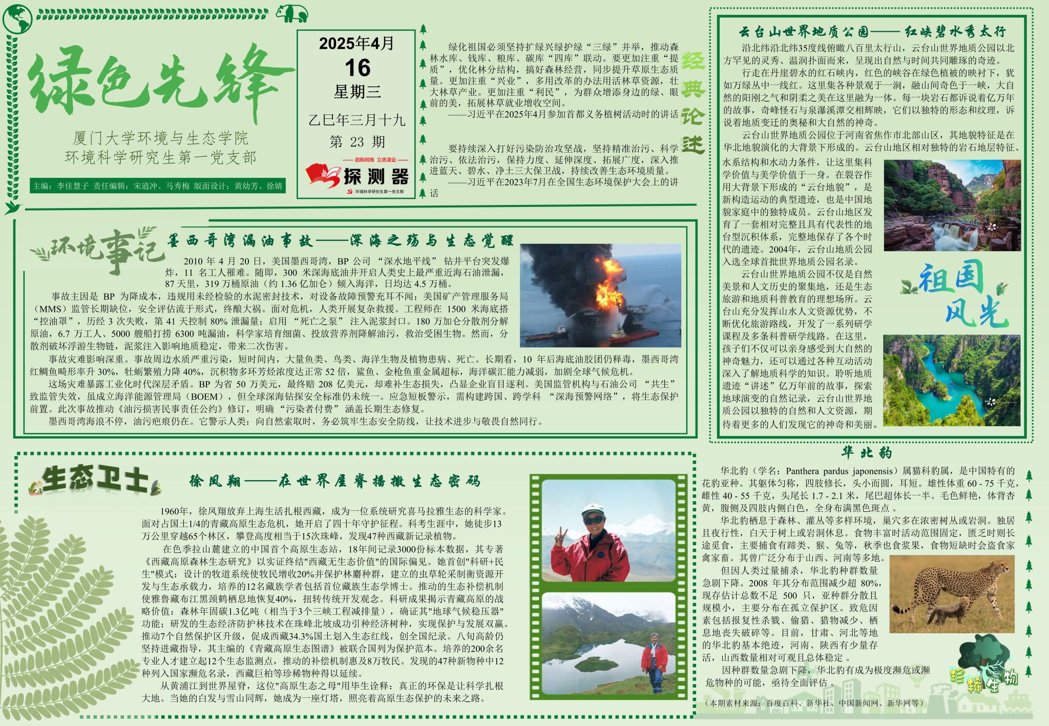 《绿色先锋》第二十三期如期而至。本期的“环境事记”讲述了历史上最严重的近海石油泄漏事故——墨西哥湾漏油事故,这场灾难深刻警示我们,工业化时代的技术发展必须与生态保护并行,防止此类事故的重演需要更加严格的安全监管和前瞻性规划;在“生态卫士”板块,介绍了一位为西藏高原生态倾注毕生心血的女性科学家——徐凤翔,她扎根西藏40余年,推动西藏的生态保护与乡村振兴并行,徐凤翔的事业表明,真正的环保不仅是科学研究,更是将生态保护与民生紧密结合,形成可持续的生态保护体系;“经典论述”回顾了习近平总书记2025年参加首都义务植树活动时和2023年在全国生态环境保护大会上的重要讲话;“祖国风光”带我们领略了云台山世界地质公园的独特魅力,作为中国北方的地质奇观,云台山以其壮丽的地貌、丰富的岩层和地质遗迹,展现了亿万年地球演变的奇迹,云台山不仅是一个自然美景的宝库,还是生态旅游和地质科普教育的重要基地;“珍稀生物”板块关注了华北豹这一极度濒危物种的现状,由于栖息地破坏、偷猎等因素,华北豹的数量急剧下降,华北豹的保护不仅是生物多样性保护的缩影,更是生态系统健康的象征,我们呼吁加强对华北豹的保护,遏制其栖息地的破坏,维护生态平衡。