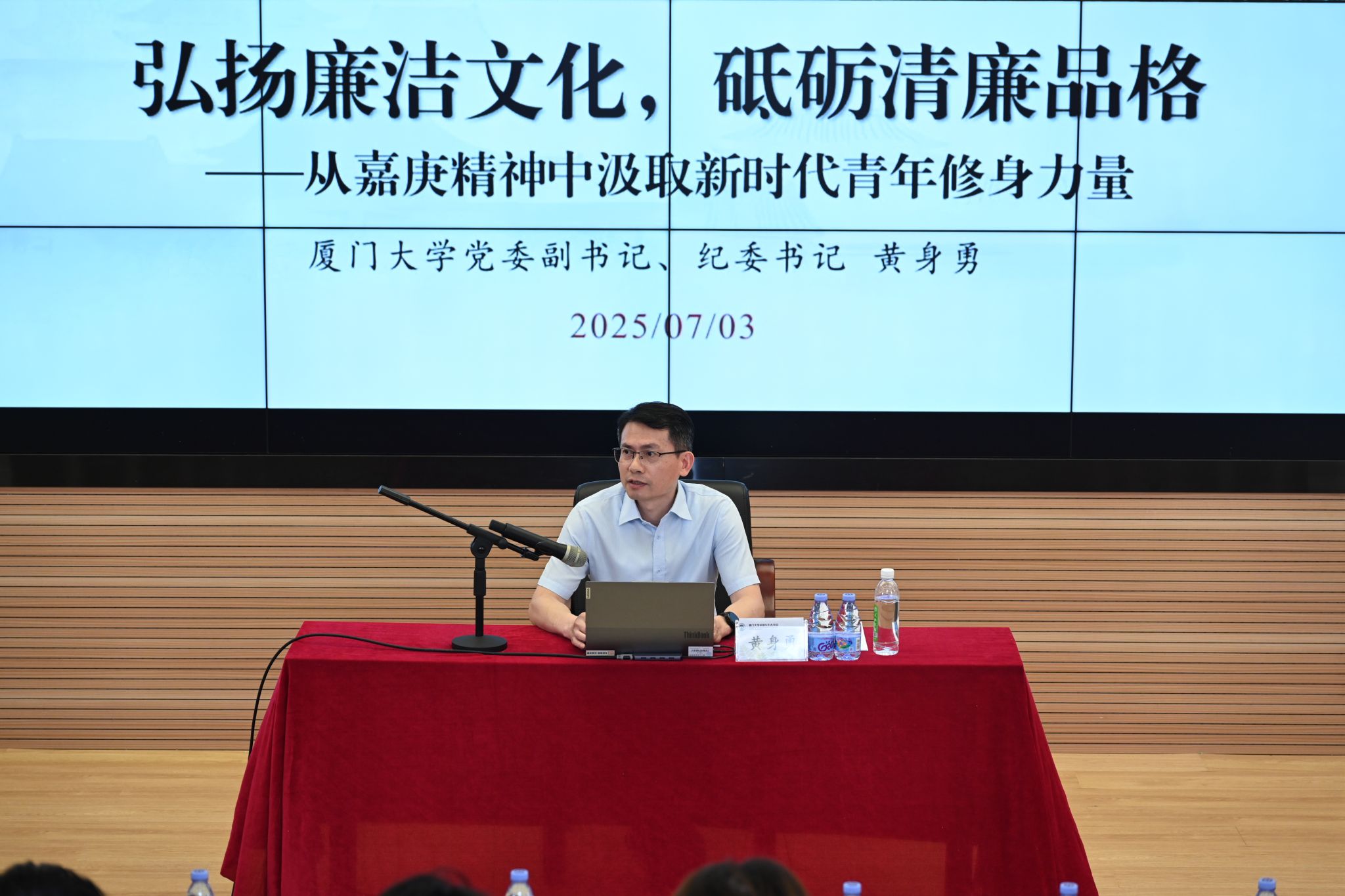 上午,在漳江口红树林湿地生态系统福建省野外科学观测研究站报告厅,校党委副书记、纪委书记、国家监委驻厦门大学监察专员黄身勇为大家讲授了“弘扬廉洁文化,砥砺清廉品格——从嘉庚精神中汲取新时代青年修身力量”的专题思政课。黄身勇以“弘扬廉洁文化,砥砺清廉品格——从嘉庚精神中汲取新时代青年修身力量”为题,从“看廉洁文化”“学廉洁典范”“树廉洁品格”三个方面展开授课,系统阐述廉洁文化发展脉络,精心讲述校主陈嘉庚先生廉洁故事,为现场师生打开了一扇通往廉洁文化与嘉庚精神的大门。