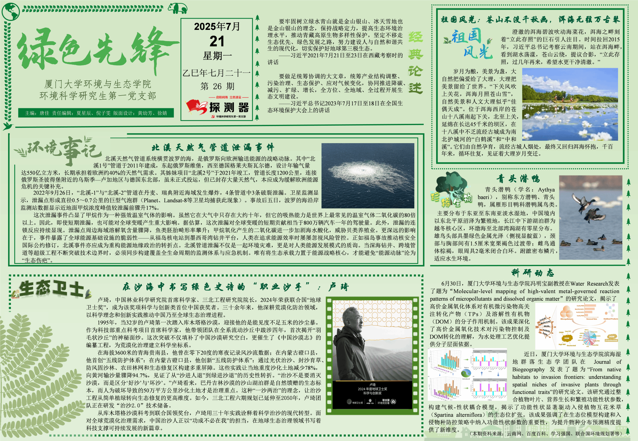 《绿色先锋》第二十六期如期而至。本期的“环境事记”关注了2022年波罗的海北溪管道泄漏事件,这是联合国确认的史上最大规模甲烷泄漏事故,对气候与海洋生态造成严重影响,引发全球对能源安全与环境代价的反思。在“生态卫士”板块,我们聚焦中国治沙专家卢琦;他三十年来坚守西北荒漠,推动荒漠化治理模式转型,用实际行动守护祖国北方生态屏障,展现了科技兴绿的责任担当。“经典论述”回顾了习近平总书记在云南洱海考察时的重要讲话,强调“绿水青山就是金山银山”,提出要珍惜自然馈赠,共建美丽中国,指明生态文明建设的方向。“祖国风光”带我们走进大理苍山洱海。碧波万顷,山水相依,这片西南高原明珠是人与自然和谐共处的生动缩影。“珍稀生物”介绍了极危鸟类青头潜鸭,它对湿地环境极为敏感,其种群变化是生态变化的晴雨表,保护青头潜鸭也就是守护生态平衡。