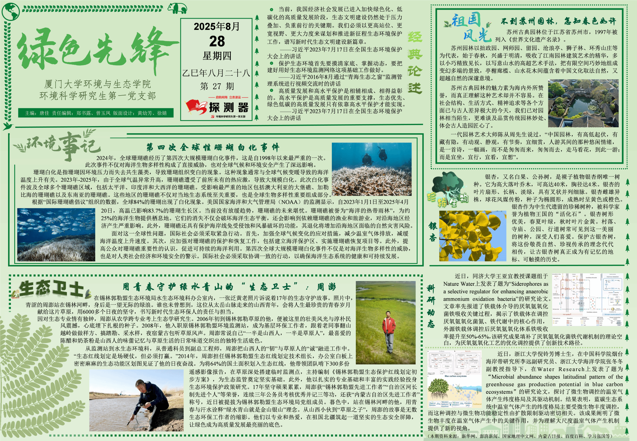 《绿色先锋》第二十七期如期而至。本期的“环境事记”关注了2024年第四次全球性珊瑚白化事件。作为“海洋的热带雨林”,珊瑚礁的退化不仅威胁海洋生物多样性,还冲击渔业、旅游业和沿海安全,凸显了气候变暖对全球生态和人类社会的深远影响。在“生态卫士”板块,我们聚焦锡林郭勒盟生态环保工作者周澎;他十七年扎根草原,从生态监测到生态红线划定,再到环保督察与政策研究,用专业与坚守守护北疆绿水青山,展现了新时代生态环保人的责任与担当。“经典论述”则回顾了习近平总书记关于生态文明建设的重要讲话,强调高质量发展必须与高水平保护相辅相成。“祖国风光”带我们走进苏州古典园林。小巧精致、诗画意境,这一江南园林艺术的瑰宝展现了人与自然相融的东方智慧。“珍稀生物”介绍了古老树种银杏,被誉为“植物界的大熊猫”,它不仅是景观佳木,更是自然与文化传承的象征。科研动态关注了同济大学王亚宜教授团队在《Nature Water》发表的研究成果,首次揭示铁载体在厌氧氨氧化菌氮、铁代谢调控中的关键作用,为氮去除工艺优化提供了新思路。同期,浙江大学倪铃芳博士生团队在《Water Research》刊发论文,发现蓝碳生态系统中温室气体产生的纬度格局主要受微生物丰度调控,为理解大尺度温室气体产生机制提供了新视角。