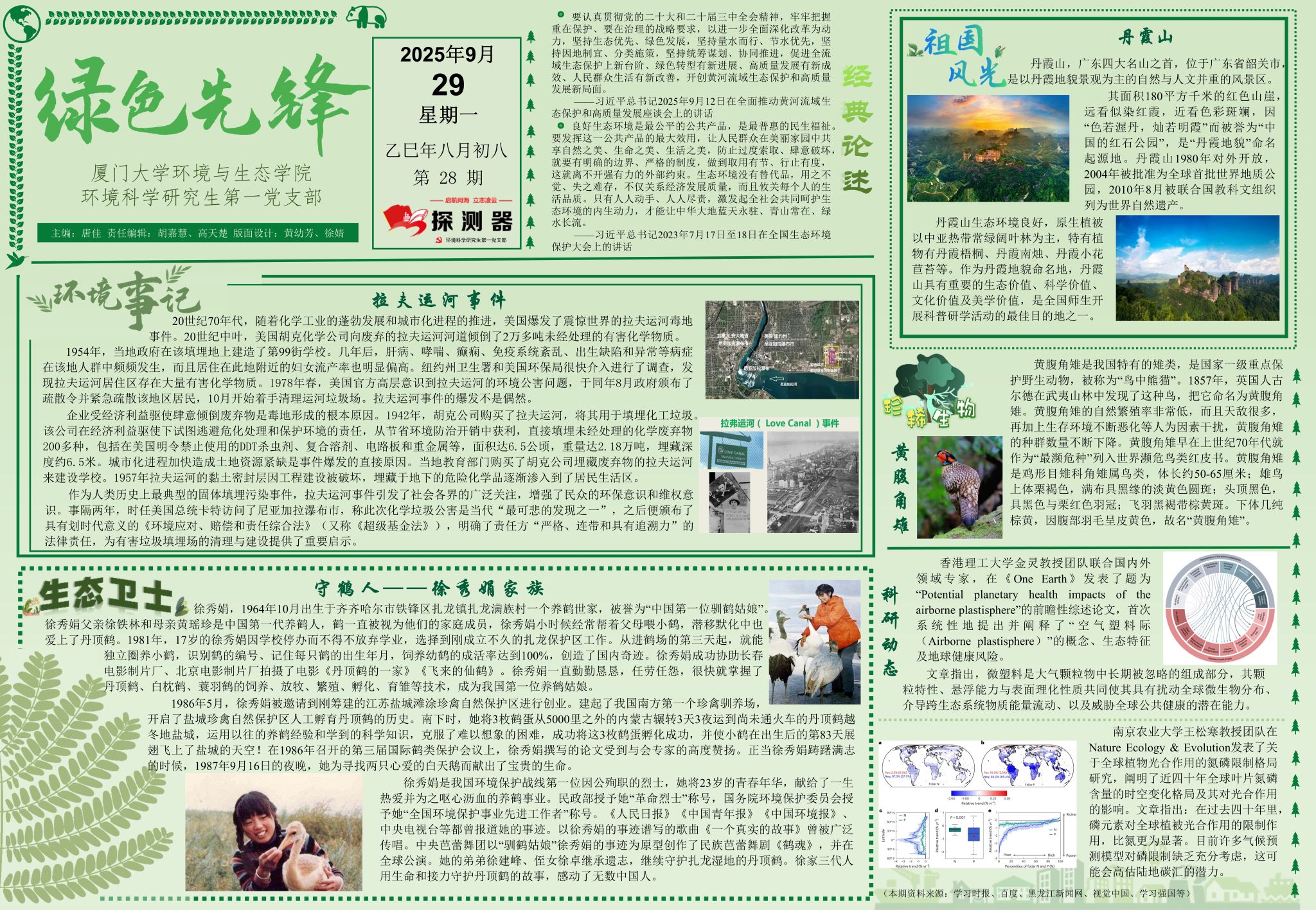 《绿色先锋》第二十八期如期而至。本期的“环境事记”关注了20世纪70年代美国拉夫运河毒地事件,这一典型固体填埋污染事故导致居民健康受损并引发大规模疏散,最终促成《超级基金法》的出台,推动了全球对危险废弃物管理和环境责任的深刻反思。在“生态卫士”板块,我们聚焦“驯鹤姑娘”徐秀娟及其家族;她用短暂而无悔的青春开创了我国人工孵育丹顶鹤的历史,因公殉职后,其亲人接力守护扎龙湿地三代人,用生命与执着谱写了人与自然和谐共生的动人篇章。“经典论述”回顾了习近平总书记在全国生态环境保护大会和黄河流域生态保护和高质量发展座谈会上的重要讲话。