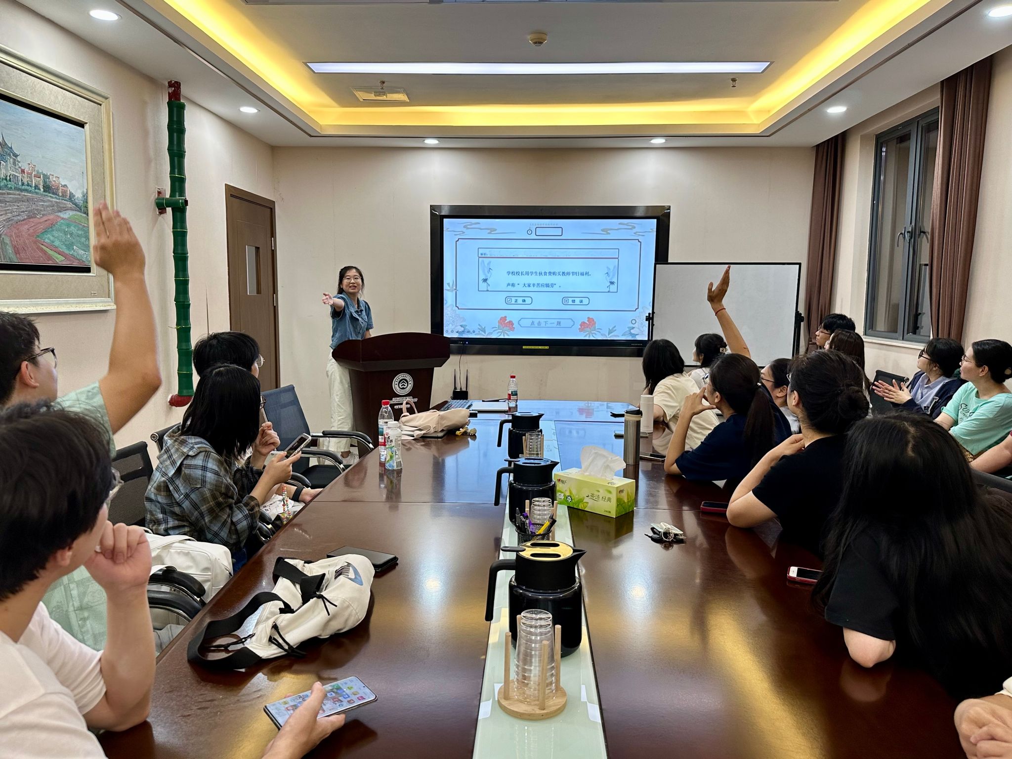 会议伊始,支部书记张凯婷首先介绍了支部的基本情况,并热烈欢迎本学期新加入的党员同志。随后开展的“情景化互动学习”环节,以“中央八项规定精神”为核心,精心设计了“纪律红线·情景快问”“清风正气·你画我猜”“学院新风共话”三大互动模块。现场气氛热烈,党员们全情投入,在思维碰撞和团队协作中实现了理论认知与行为规范的深度融合,实现了“以赛促学、以学促行”的教育目标。
