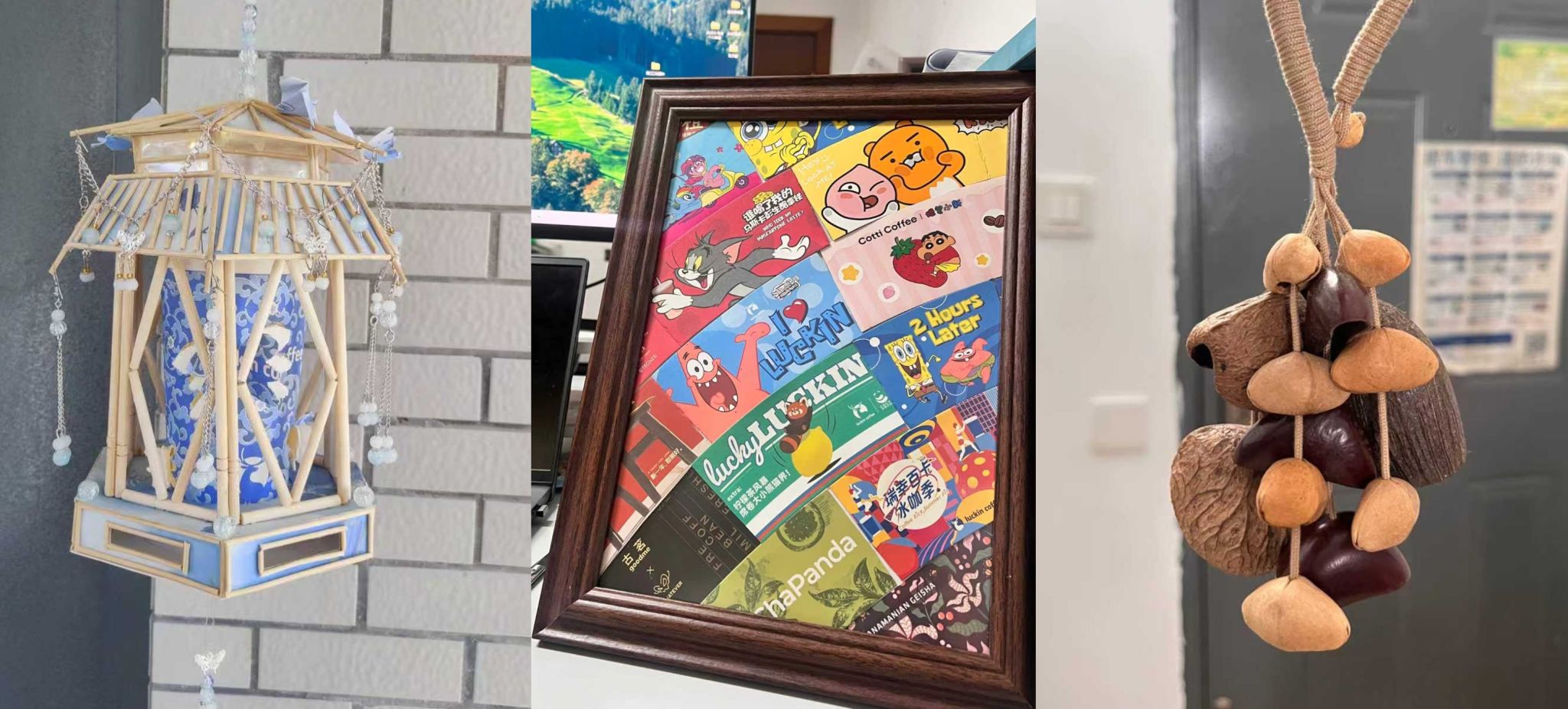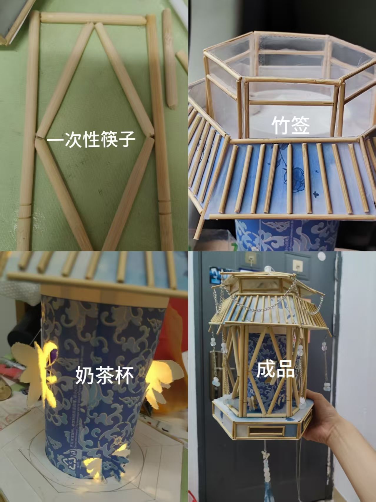 赵佳媛利用一次性筷子、竹签和奶茶杯等身边易得材料制作的“手提蝴蝶灯笼”创意十足,兼具实用性、创新型与观赏性,深受大家喜爱。