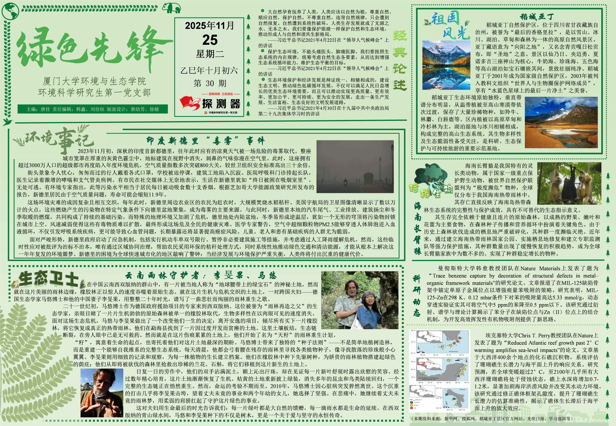 《绿色先锋》第三十期如期而至。本期“环境事记”关注2023年印度新德里的“毒雾”事件:空气质量指数屡破800,城市被浓霾笼罩,学校停课、医院爆满,污染由秸秆焚烧、交通与工业排放及逆温共同促成,警示全球城市化必须同步推进环境治理。“生态卫士”讲述云南雨林守护者李旻果与丈夫马悠二十年如一日复育受破坏的热带雨林,从“种子法则”到完整生态链重建,他们以生命守护“地球腰带上的绿宝石”。“经典论述”回顾习近平总书记关于生态文明建设的重要讲话,强调坚持尊重自然、绿色发展与系统治理,实现经济发展与生态保护协同共进。
