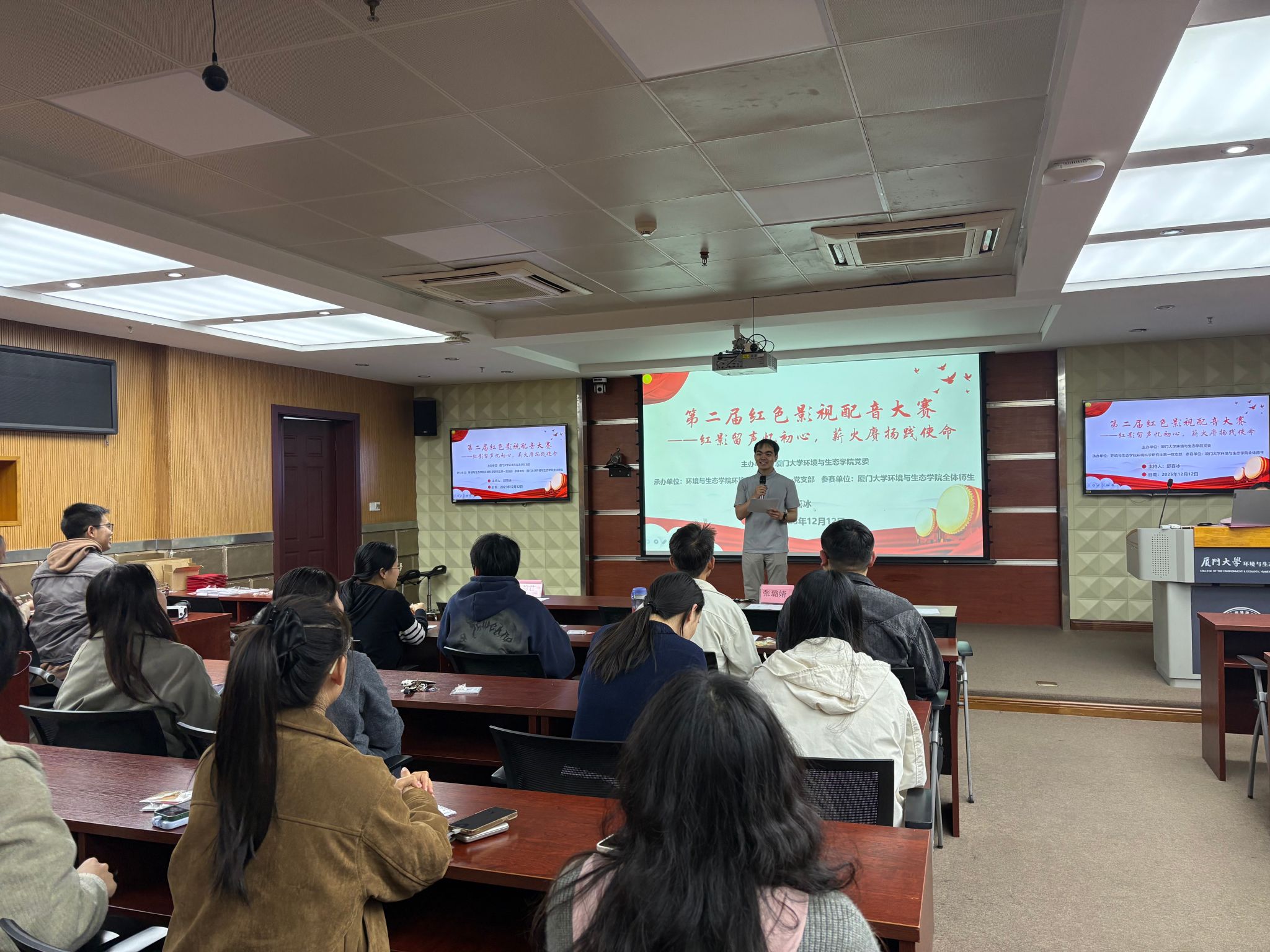 2025年正值中国人民抗日战争暨世界反法西斯战争胜利80周年,亦是中共四大召开百年之际,红色历史的厚重底蕴与时代使命在这一年交相辉映。习近平总书记在叶剑英纪念园考察时强调,要结合党史宣传教育讲好革命先辈故事,传承红色基因,而“十五五”规划更明确提出以红色资源筑牢青少年信仰之基。在此背景下,环境科学研究生第一党支部于12月12日晚上在金泉楼A239会议室举办“红影留声忆初心,薪火赓扬践使命”为主题的红色经典影视配音比赛,支部全体党员参加活动。