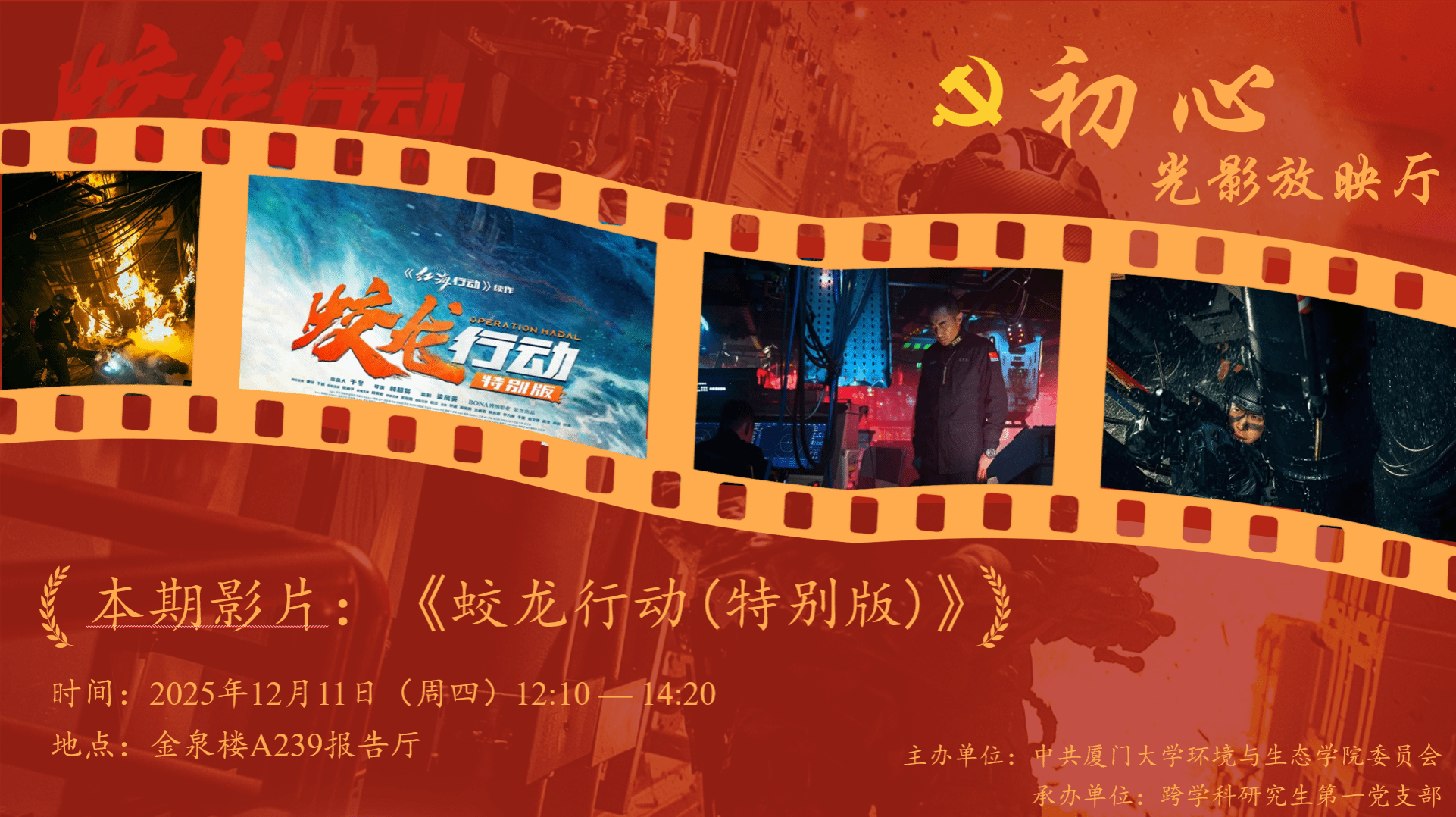 为深入学习贯彻党的二十大和二十届四中全会精神,厚植家国情怀,强化使命担当,12月11日中午,学院在金泉楼A239报告厅组织第二十七期“初心光影放映厅”活动,本期观看电影为军事题材电影《蛟龙行动(特别版)》。活动由学院党委主办,跨学科研究生第一党支部承办,学院部分党员及本期预备党员培训班、入党积极分子培训班的成员共同观影。