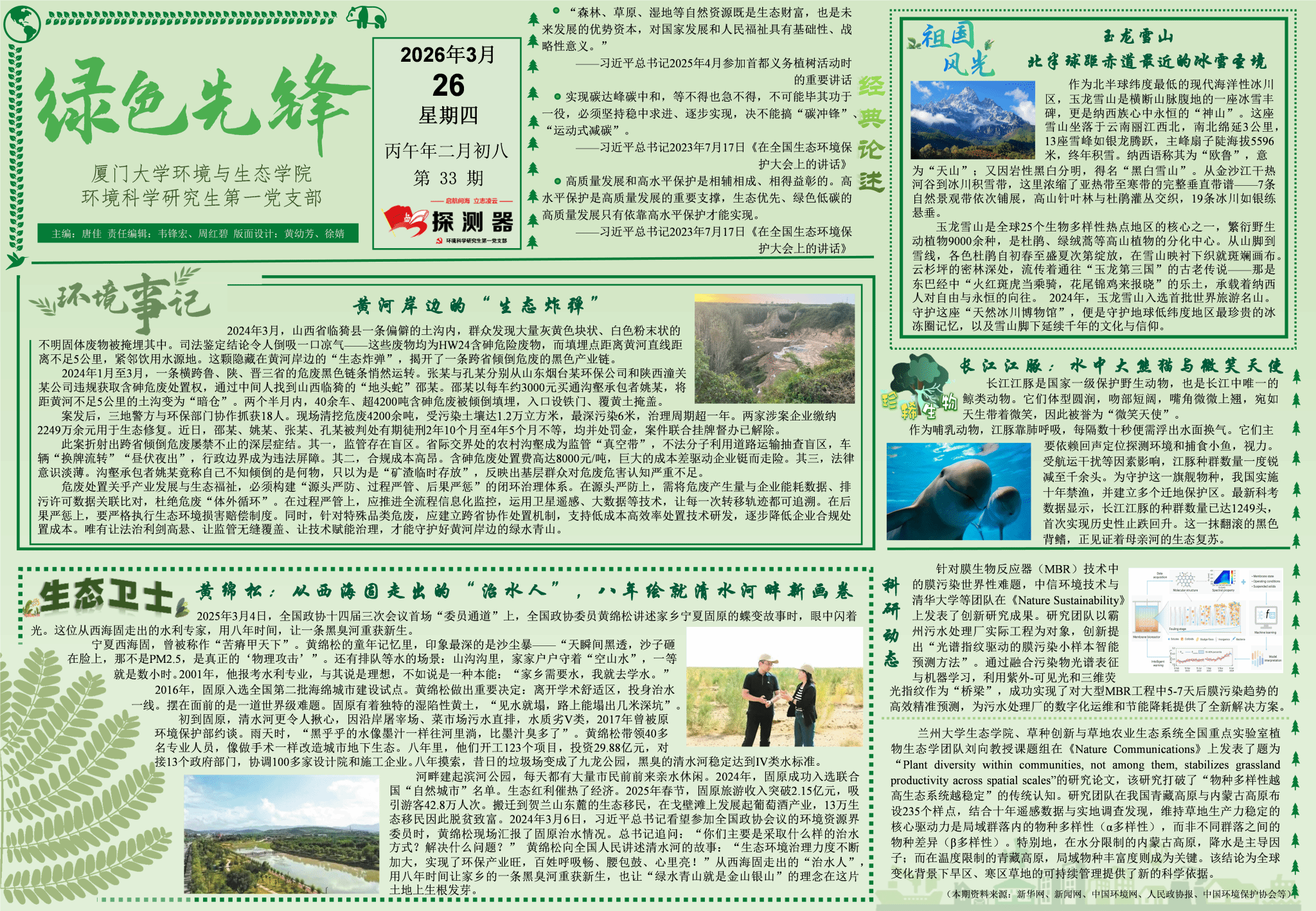 “科研动态”关注两项前沿成果。中信环境技术与清华大学团队在《Nature Sustainability》提出光谱指纹驱动的膜污染智能预测方法,实现大型MBR工程膜污染的提前预判,助力污水处理数字化运维。兰州大学团队在《Nature Communications》揭示草地生产力稳定性的关键在于群落内部的物种多样性,为青藏高原与内蒙古高原草地可持续管理提供新思路。