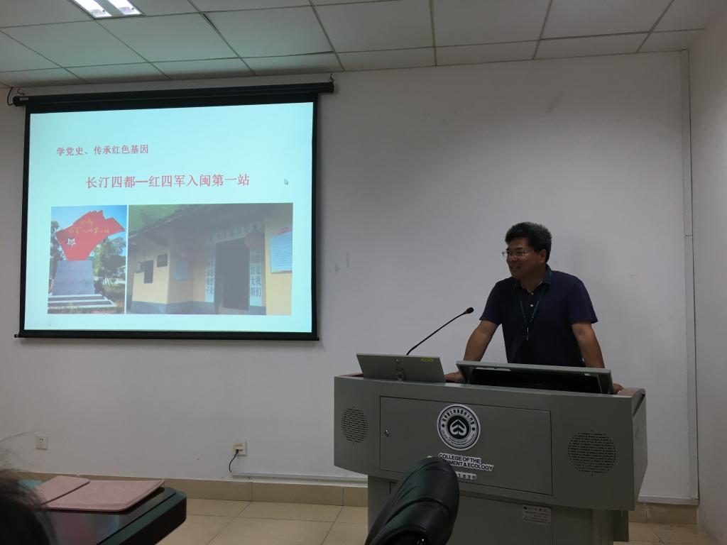 率先走上讲台的是郭小玲,她以高校实验室安全文化建设为主题,将她在安全管理培训中领悟到的新的认知带到讲堂,她指出,新的安全管理理念能更好地指导我们的实际工作,作为实验课老师,要立足岗位发挥党员先锋模范作用。随后,支部党员分别结合生态文明建设谈理解与使命、结合暑期社会实践和工作实际谈体会与经验、结合党的最新理论知识谈认知和理解、结合观看的电影或时代楷模谈责任与担当等多主体分享了自己的心得与体会。最后,学院党委委员、院工会主席杨盛昌做了题为《学党史、传承红色基因》的专题报告,他从红四军入闽第一站——长汀四都展开,重温了红四军在闽的历史,也指出了长汀在中国革命史上占据重要的历史地位。