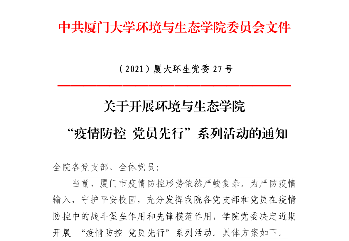 当前,厦门市疫情防控形势严峻复杂,为严防疫情输入,守护平安校园,9月18日,我院党委第一时间启动“疫情防控 党员先行”系列活动,通过设立“线上教学先锋岗”“学生宿舍先锋岗”“健康信息先锋岗”“爱心保障先锋岗”四个先锋岗,搭建三级网格管理系统,成立若干突击队,开展多样活动等,组织广大党员积极投身疫情防控工作中,用自己的行动让党旗在疫情防控歼灭战的第一线高高飘扬,让党徽在疫情防控阵地上熠熠生辉。