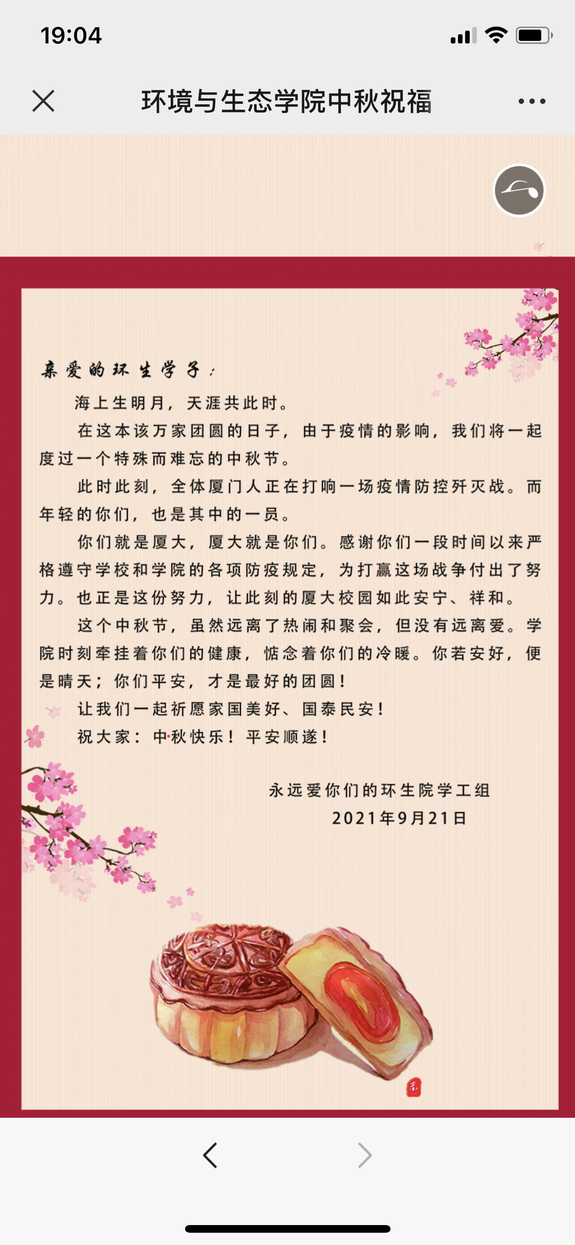 在刚刚过去的中秋节当天,学院学工组给全体学生送上电子贺卡,云寄祝福,并举办线上中秋晚会,院领导、辅导员、班主任与学生共度佳节。接下来,各支部还将参与组织线上运动会、线上知识竞赛等活动,丰富学生们的业余生活。