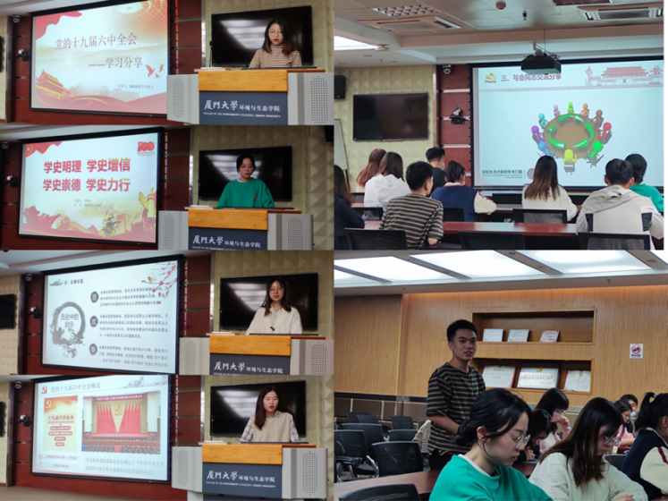 为深入学习贯彻党的十九届六中全会精神,进一步推进党史学习教育工作,激励支部党员同志们不忘初心、砥砺前行,11月19日晚修复与可持续生态学研究生党支部在金泉楼A239室召开党员大会,将党的十九届六中全会精神学习与党史学习教育相结合,通过党员讲党课的方式对上述主题进行深入学习。会议由支部委员郭桢丽同志主持,刘善乐、方俊华、张家维三位党员同志分别结合主题进行了分享。