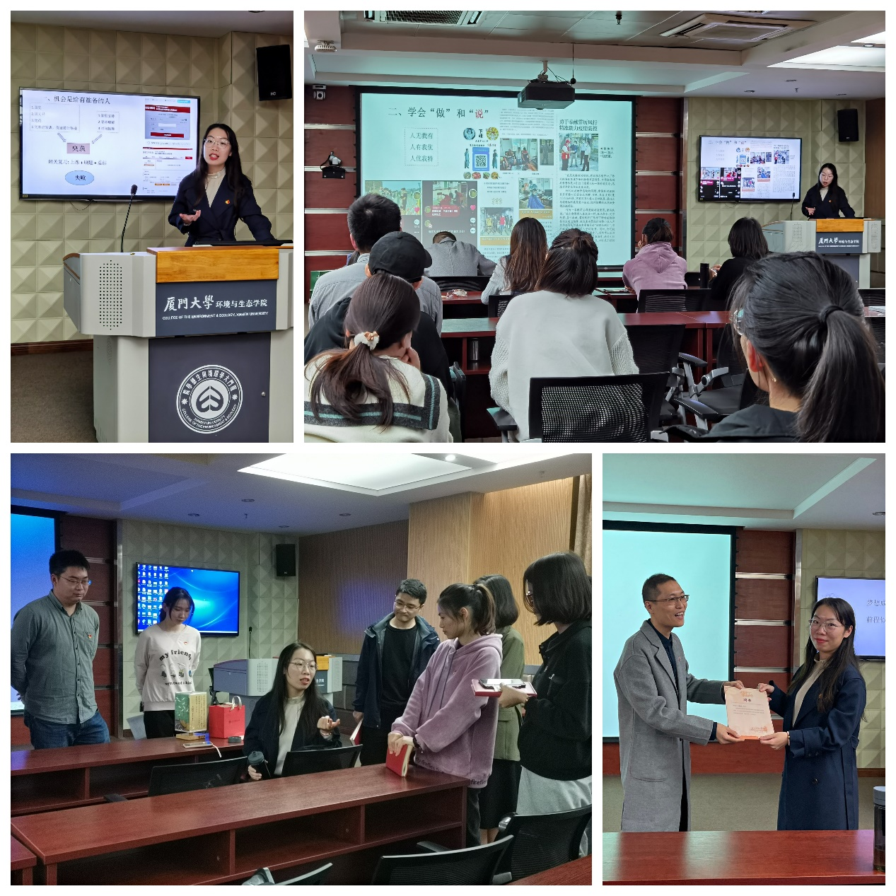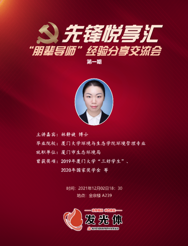 12月2日,海洋环境生物学研究生党支部先锋悦享汇之“朋辈导师”经验分享交流会在金泉楼A239举办。厦门市生态环境局、厦门大学环境与生态学院2021届博士毕业生林静婕应邀出席,她分享了自己博士学习期间以及工作过程中的宝贵经验,支部全体党员和积极分子32人参加活动。