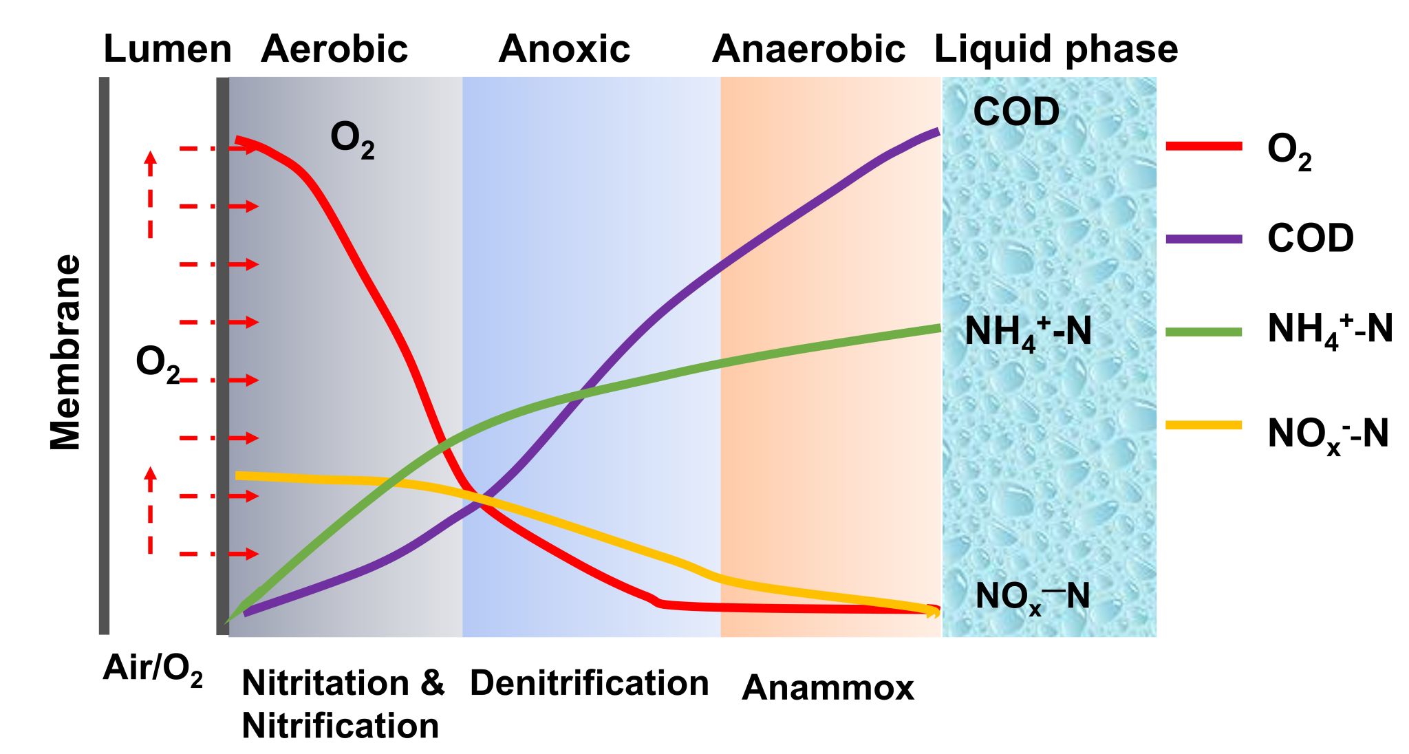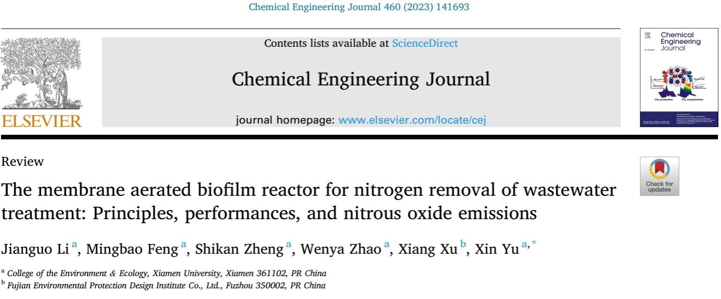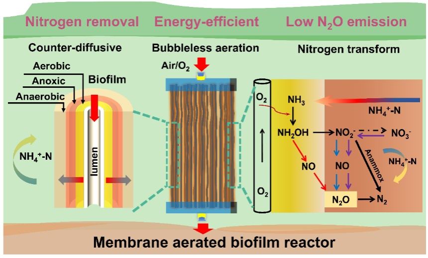 近日,我院水质安全团队于鑫课题组在环境领域高水平期刊Chemical Engineering Journal上发表了题为“The membrane aerated biofilm reactor for nitrogen removal of wastewater treatment: Principles, performances, and nitrous oxide emissions”的综述论文。该项工作调研了近20年膜曝气生物膜反应器(Membrane aerated biofilm bioreactor, MABR)的实验研究和中试应用,全面阐述了MABR的异向传质原理、生物膜脱氮机制、新型氮去除过程及N2O产生与消耗机理。同时总结了影响MABR脱氮的主要因素,包括反应器设计、操作条件、N2O排放和缓解措施,为开发MABR脱氮技术提供了全面的理论参考。