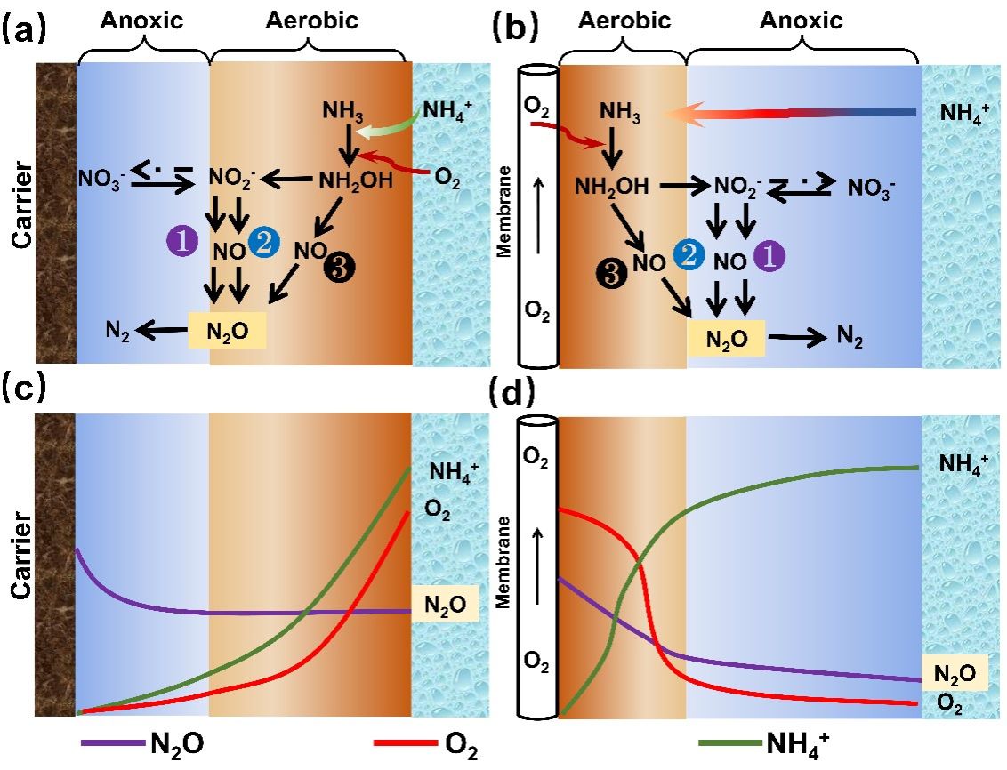 (c)、(d)分别为传统生物膜和MABR中N2O的产生和消耗。