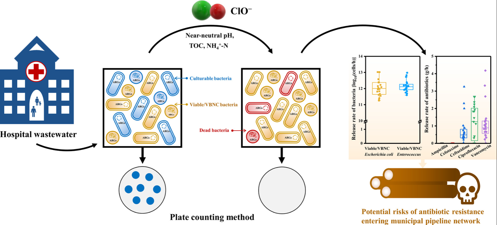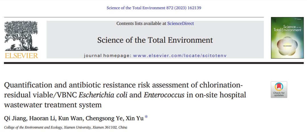 近日,我院水质安全团队于鑫课题组在环境领域期刊Science of the Total Environment上发表了题为“Quantification and antibiotic resistance risk assessment of chlorination-residual viable/VBNC Escherichia coli and Enterococcus in on-site hospital wastewater treatment system”的论文。本论文对采用氯化消毒的医院废水处理系统中具有代表性的活性/VBNC大肠杆菌和肠球菌以及相应的抗生素进行系统调研,考察氯化处理的消毒效果,评估与活性/VBNC大肠杆菌和肠球菌和相应抗生素关联的抗生素抗性风险。研究结果有助于深入理解医院废水的抗生素抗性风险。