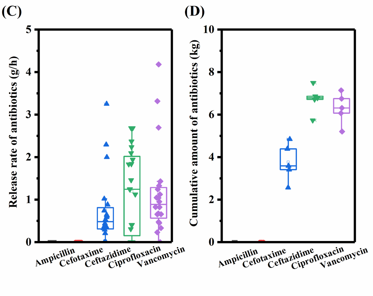 图1从2021年10月至2022年5月医院废水经氯化处理后活性/VBNC大肠杆菌和肠球菌以及相应抗生素排入市政管网的释放速率(A)(C)与累积量(B)(D)