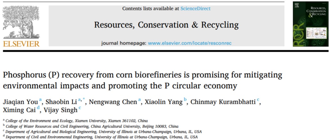 You, J., Li, S., Chen, N., Yang, X., Kurambhatti, C., Cai, X. and Singh, V., 2023. “Phosphorus (P) recovery from corn biorefineries is promising for mitigating environmental impacts and promoting the P circular economy.” Resources, Conservation & Recycling, 198, 107194.