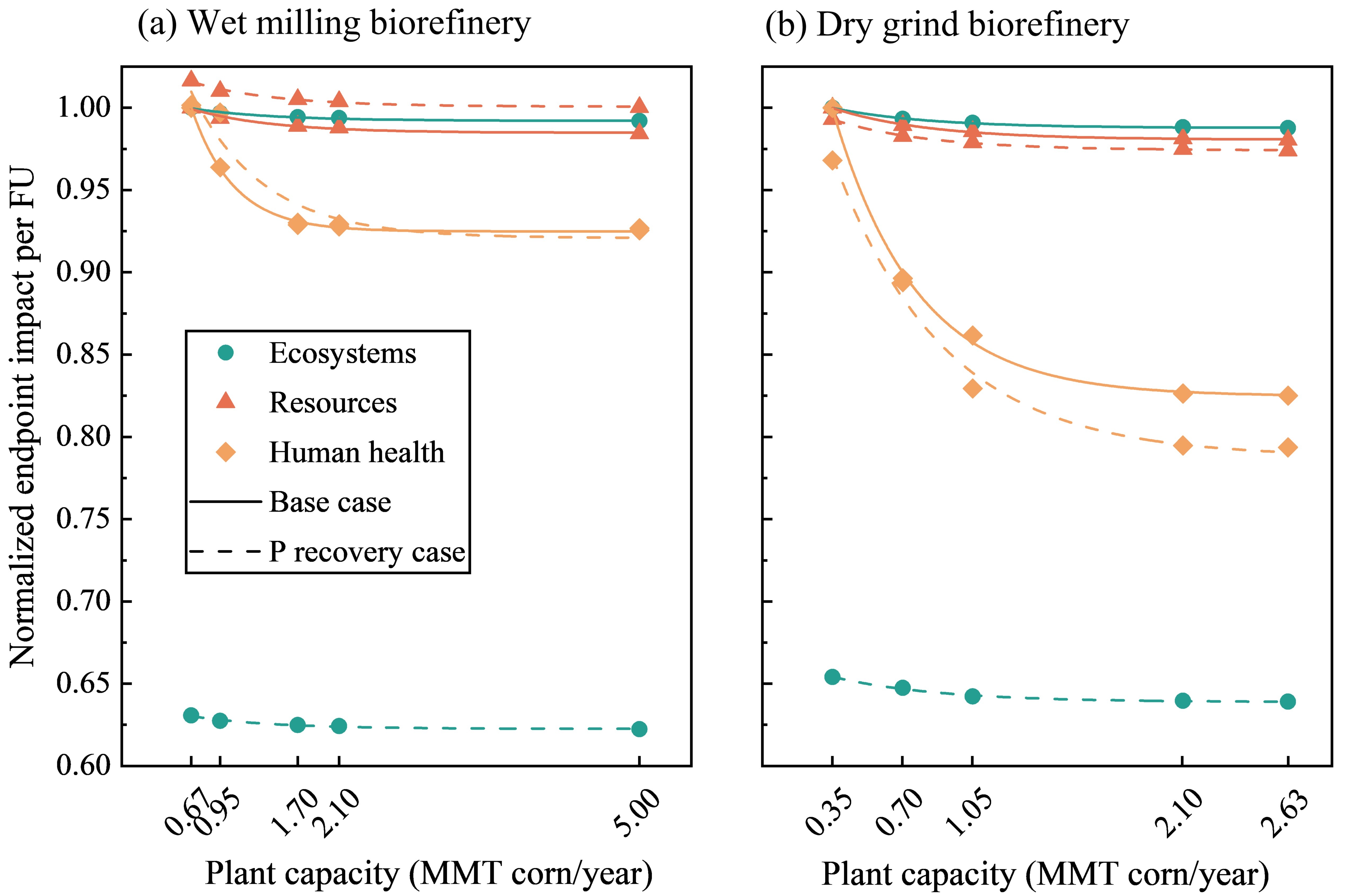 图3. 不同生产规模下(a)玉米湿磨工厂和(b)玉米干磨工厂的归一化终点环境影响变化。此处归一化终点影响是指给定生产规模下的环境影响与基准情景(base case)下最小生产规模的环境影响的比值。
