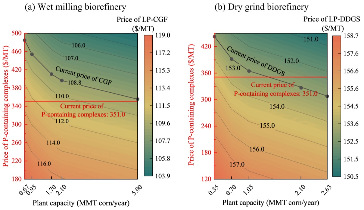 图4. 不同生产规模下的磷回收产品和玉米生物提炼副产品的最低售价(MSP)变化。(a)玉米湿磨工厂;(b)玉米干磨工厂。右侧的色阶表示磷回收情景(P recovery case)下生产的低磷动物饲料的价格。在给定动物饲料价格的情况下,图中的每一点都是含磷肥料的MSP,以达到基准情景(base case)和磷回收情景(P recovery case)之间的盈亏平衡。