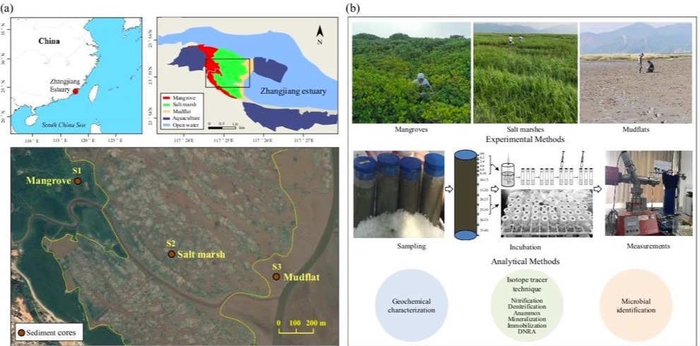 红树林是海岸带重要的“蓝碳”生态系统之一,主要生长在热带、亚热带河口海岸潮间带,在水质净化、防风消浪、固碳储碳、维护生物多样性和调节气候变化等方面发挥重要作用。与美国、澳大利亚等国家红树林扩张进入盐沼湿地不同,我国南方滨海湿地普遍存在盐沼(互花米草)入侵或扩张现象。互花米草由于具有较高的耐盐和耐缺氧能力、较强的繁殖和竞争力等特性,可扩张进入原生红树林湿地系统,从而形成红树林-盐沼生态交错带(如福建漳江口湿地)。人类活动增加了营养物质的向海输送量,红树林湿地常被认为是氮汇,可通过沉积物中反硝化和厌氧氨氧化过程将水中无机氮转化为氮气,有利于降低氮污染导致的近海富营养化风险。然而,目前对于盐沼扩张对原有红树林湿地系统氮循环过程,特别是对沉积物的脱氮能力(本研究定义为:无机氮产生过程与消耗过程速率之差,即氮的净累积或净去除量)及水质净化功能的影响,尚缺乏针对性研究。